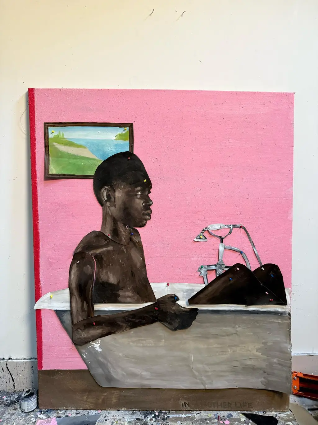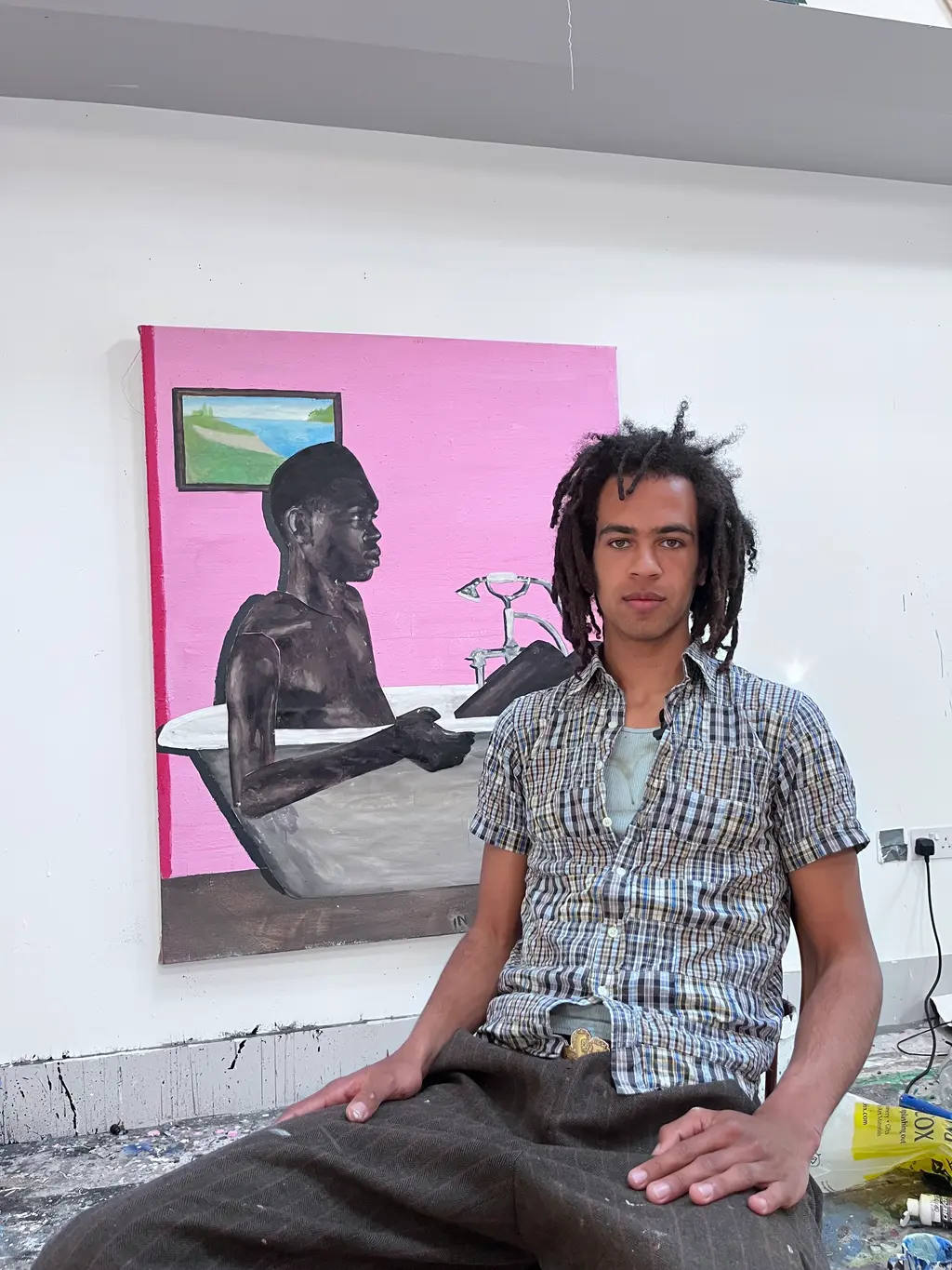 His scenes foreground the motion and gestures of bodies in everyday life: figures play dominoes, pass each other on the street or pray in domestic settings. While drawing on recognisable influences such as figurative painter Kerry James Marshall, late Malian photographer Malik Sidibé and digital artist Frank Dorrey, Cato’s work is exceptionally personal, and most of his references derive from imagery of characters near his studio in Peckham.