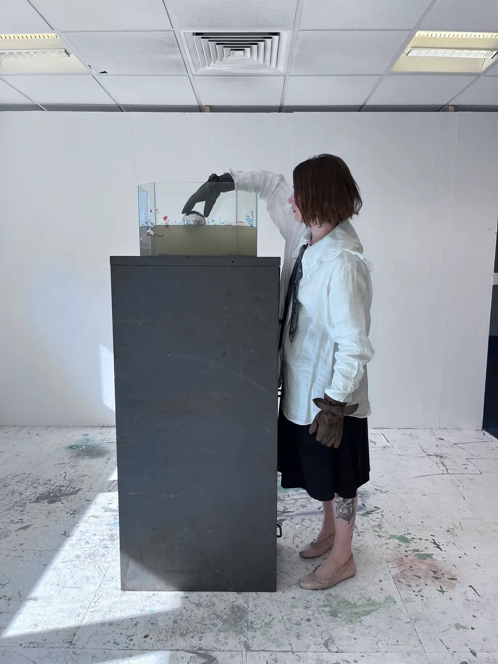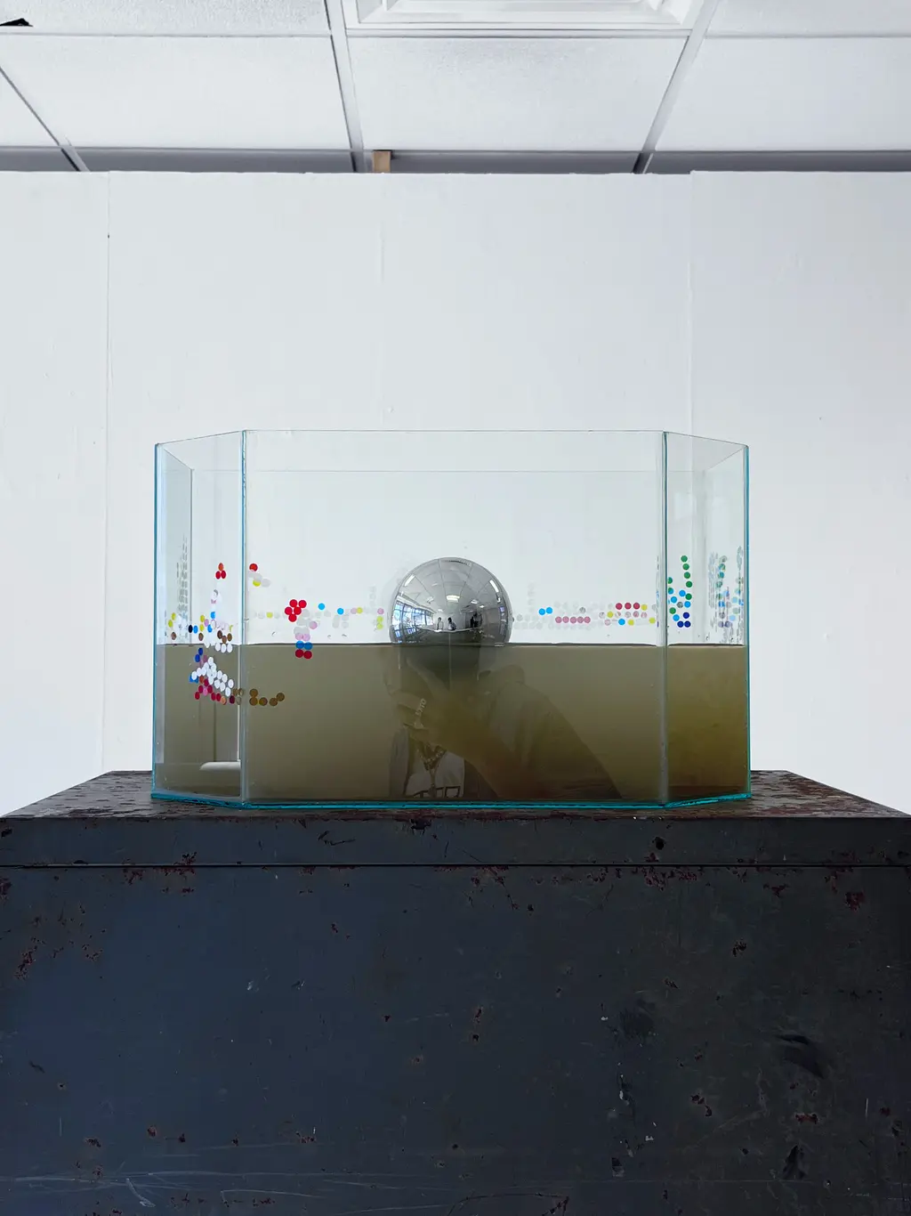 For this project, Barrow has created a sculptural work incorporating her local surroundings and immersive research practice. Featuring water from the River Thames and a chrome sphere inspired by the Barbican’s ponds, the work plays with Seurat’s use of colour, light and the reflective surface of the water in Bathers…