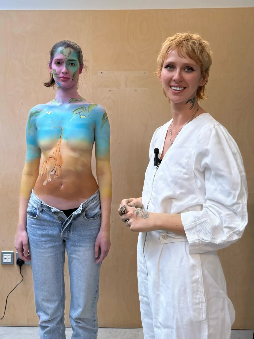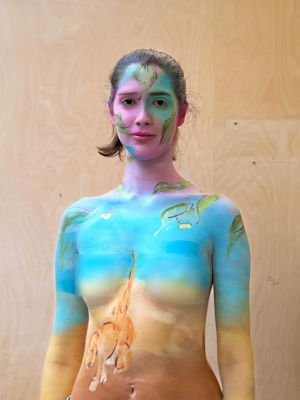 In response to Bathers… Grace has created a full upper-body makeup look, taking cues from her own local Asnières-sur-Seine. Her resulting work incorporates various aspects of Seurat’s technique, such as visible textured brushstrokes and a pastel palette.