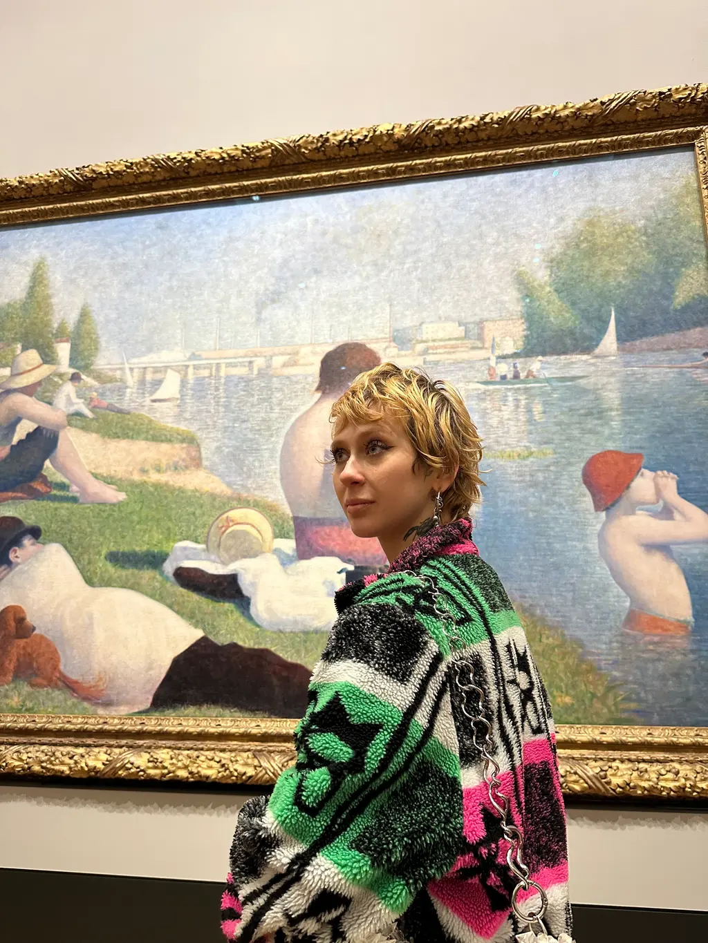 Discovering that Seurat was intentionally throwing shade at the looseness of the Impressionists changed my reading. He wasn’t romanticising leisure – he was making something cooler, more analytical. He takes this archetypal bourgeois subject, bathers by the river, and elevates working-class figures into a kind of modern myth. They become almost architectural, paired with the industrial environment that’s creeping into the background. The way their bodies interact with light, glowing auras emanating from them, gives them life.