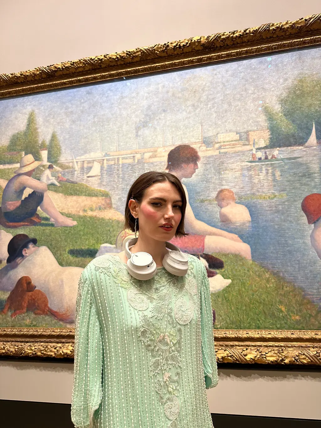 Grace Sinnott stands before Bathers at Asnières (1884)
