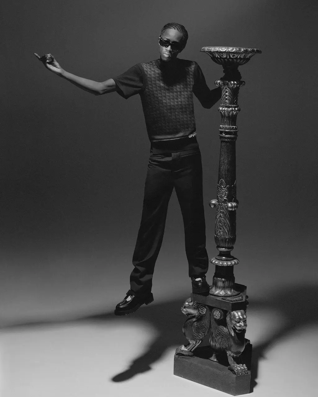 Unknown T wears vest and trousers GIVENCHY, shoes VALENTINO and sunglasses BALENCIAGA
