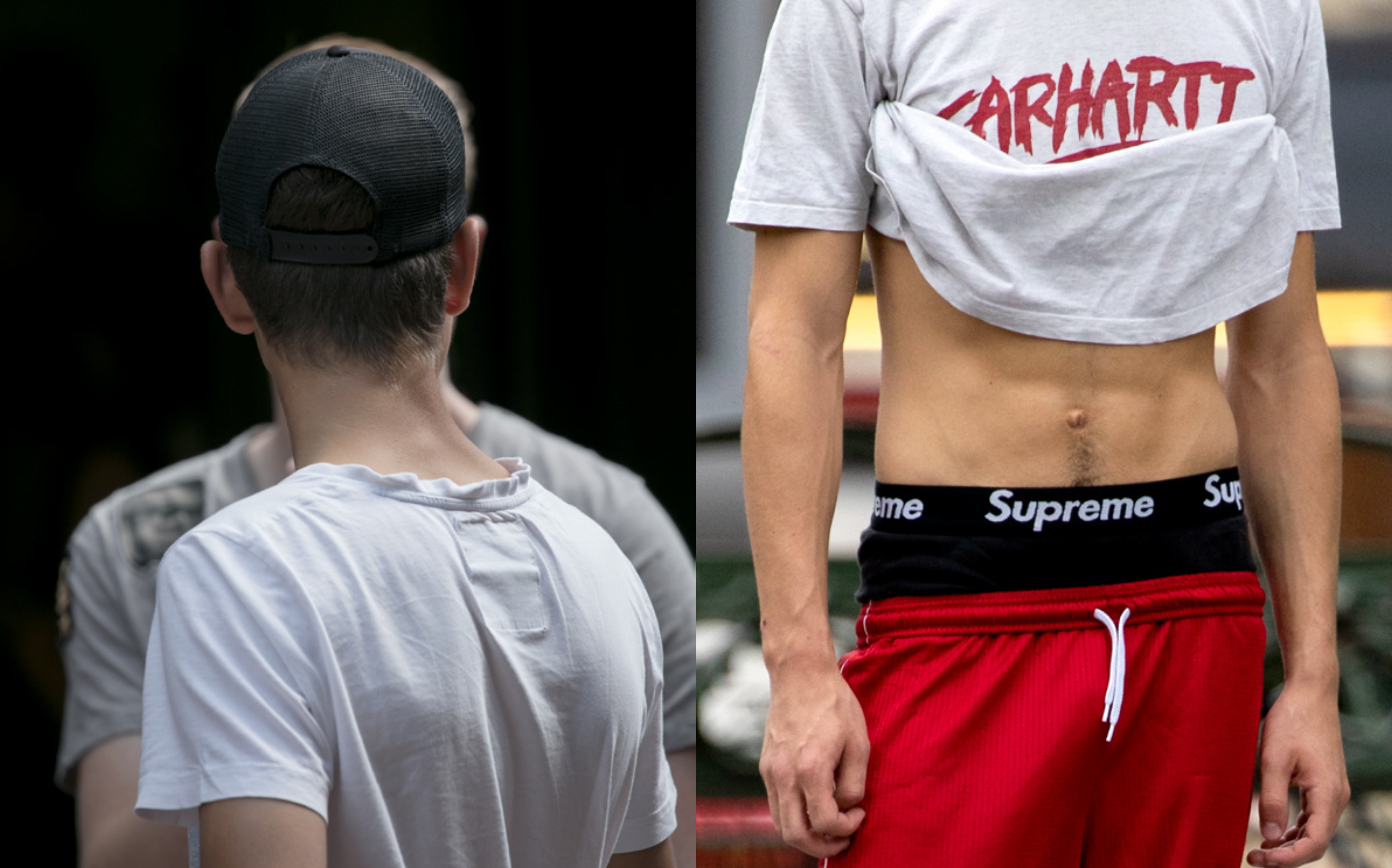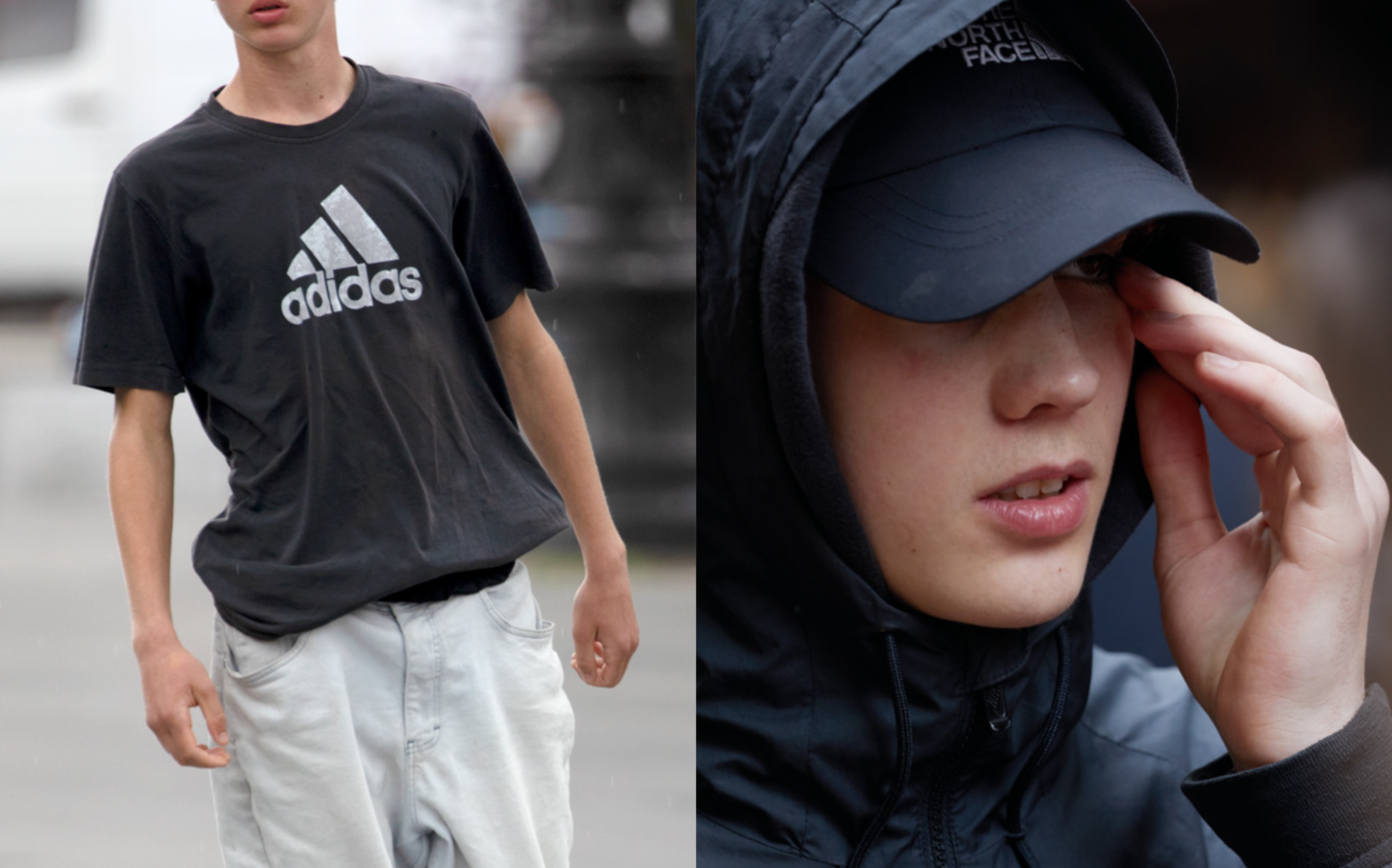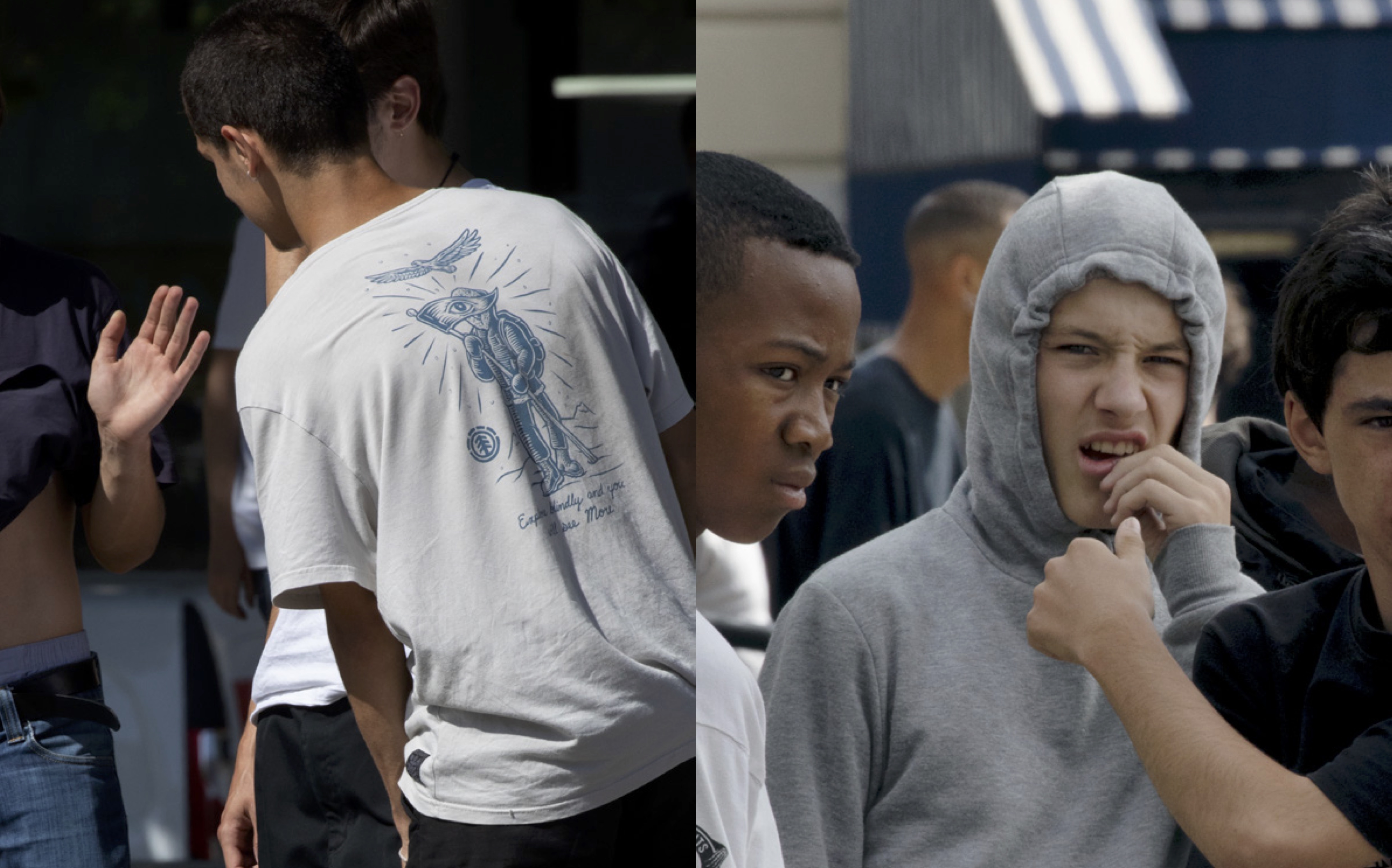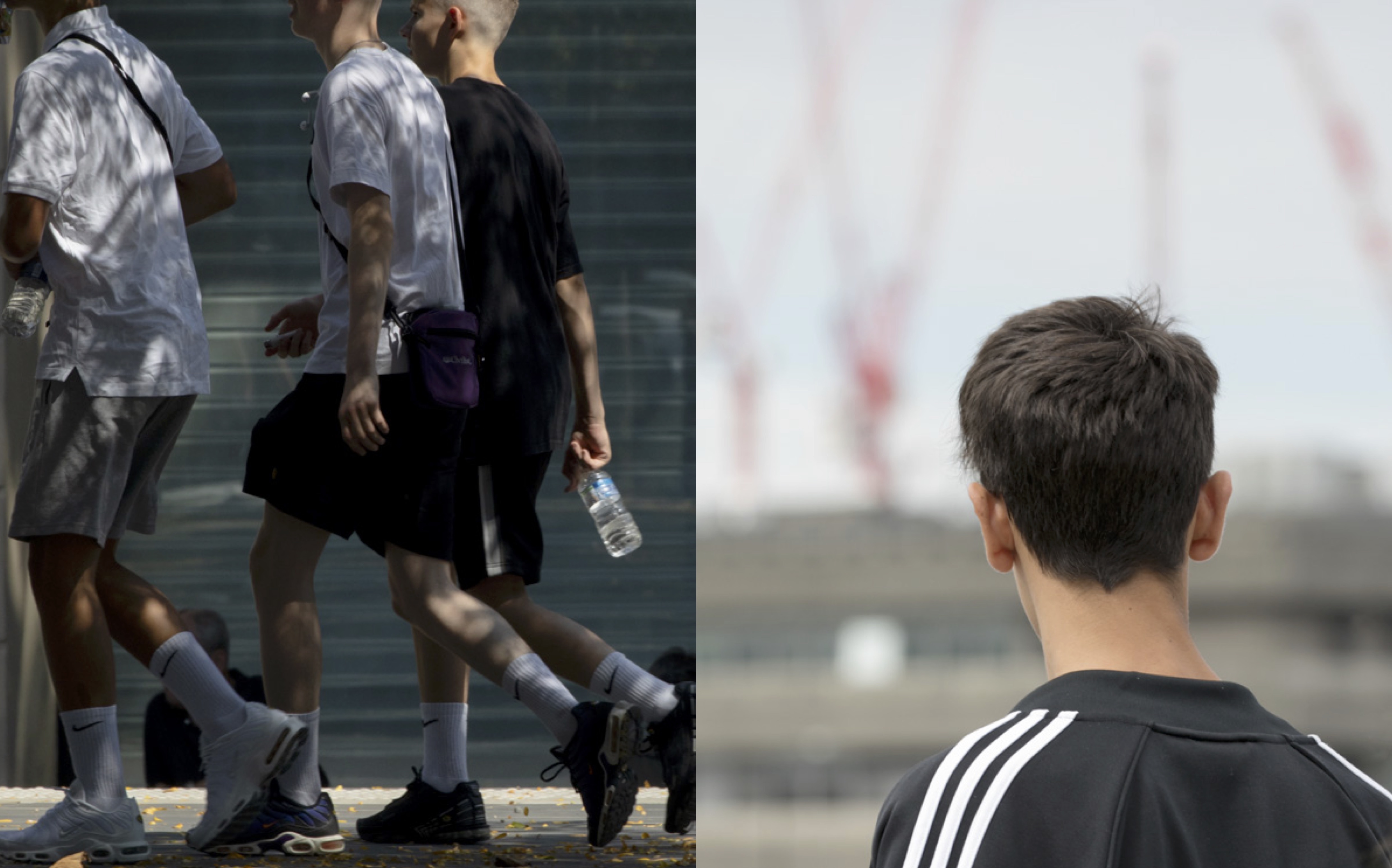 But what he’s interested in isn’t wildlife or architecture. Instead, he’s laser-focused on the teenagers who congregate in clouds of vape smoke, swigging coolly from bottles of ice tea. Dressed in Nike joggers and North Face waterproofs, they gas each other up as the sun glints off their heavy-set chains.