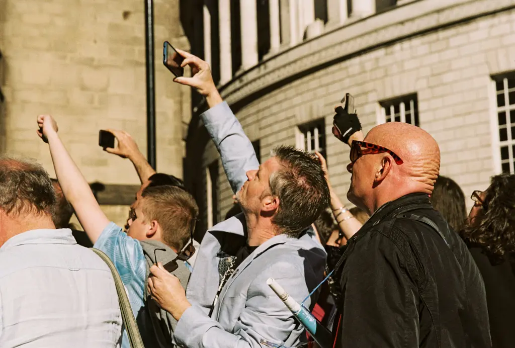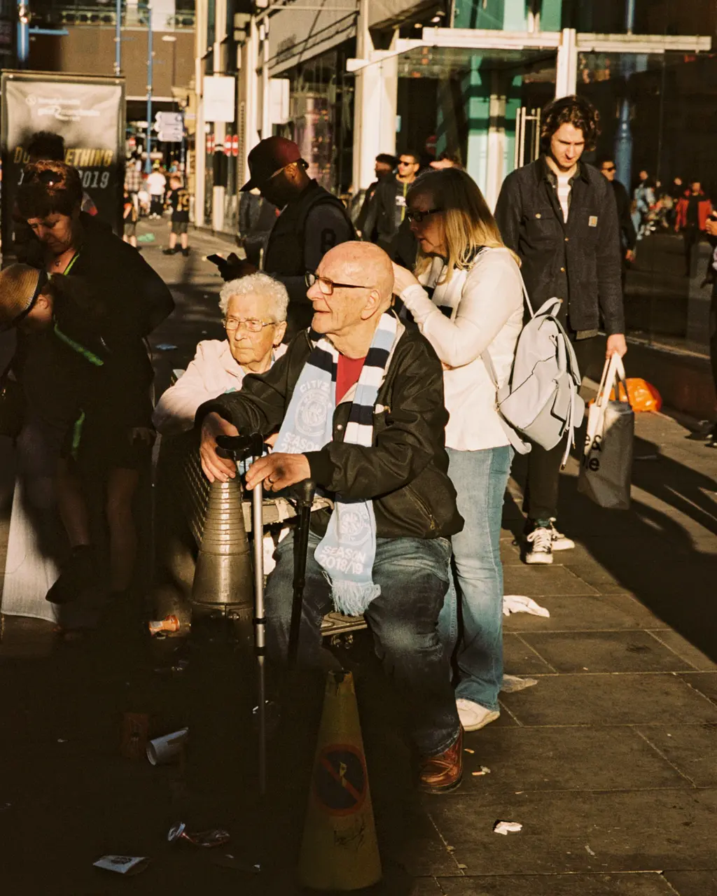From three mouthy boys atop a brick wall leading the crowd with their impressive chant skills, to the die-hard footy veterans, and a fidgety group of siblings thrilled to have left school early – onlookers watched as favourite Ederson Moraes banged the edge of the bus, while chanting, “Blue moon/You saw me standing alone/Without a dream in my heart/Without a love of my own.”