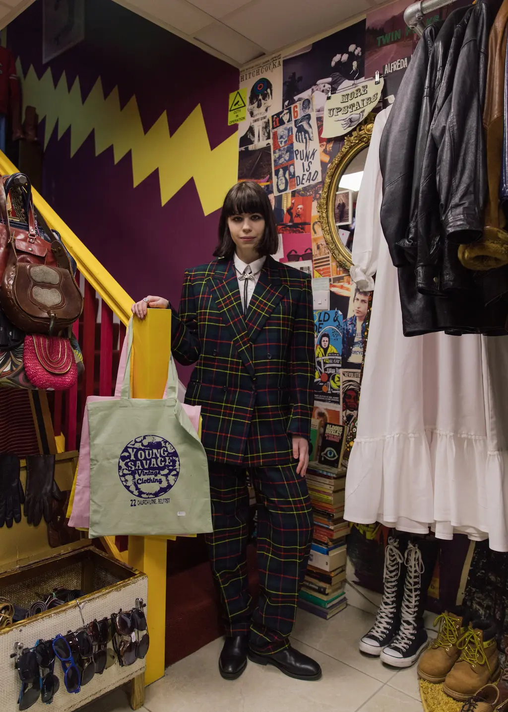 Dipping into local vintage and record store Young Savage, rockabilly blasts on the record player. I get talking to shop assistant Robyn Dilworth. The Belfast-born 23-year-old is in charge of the music selection and striking in a tartan ’80s Mr Eddie suit and bolo tie. She’s worked here since she was 16.