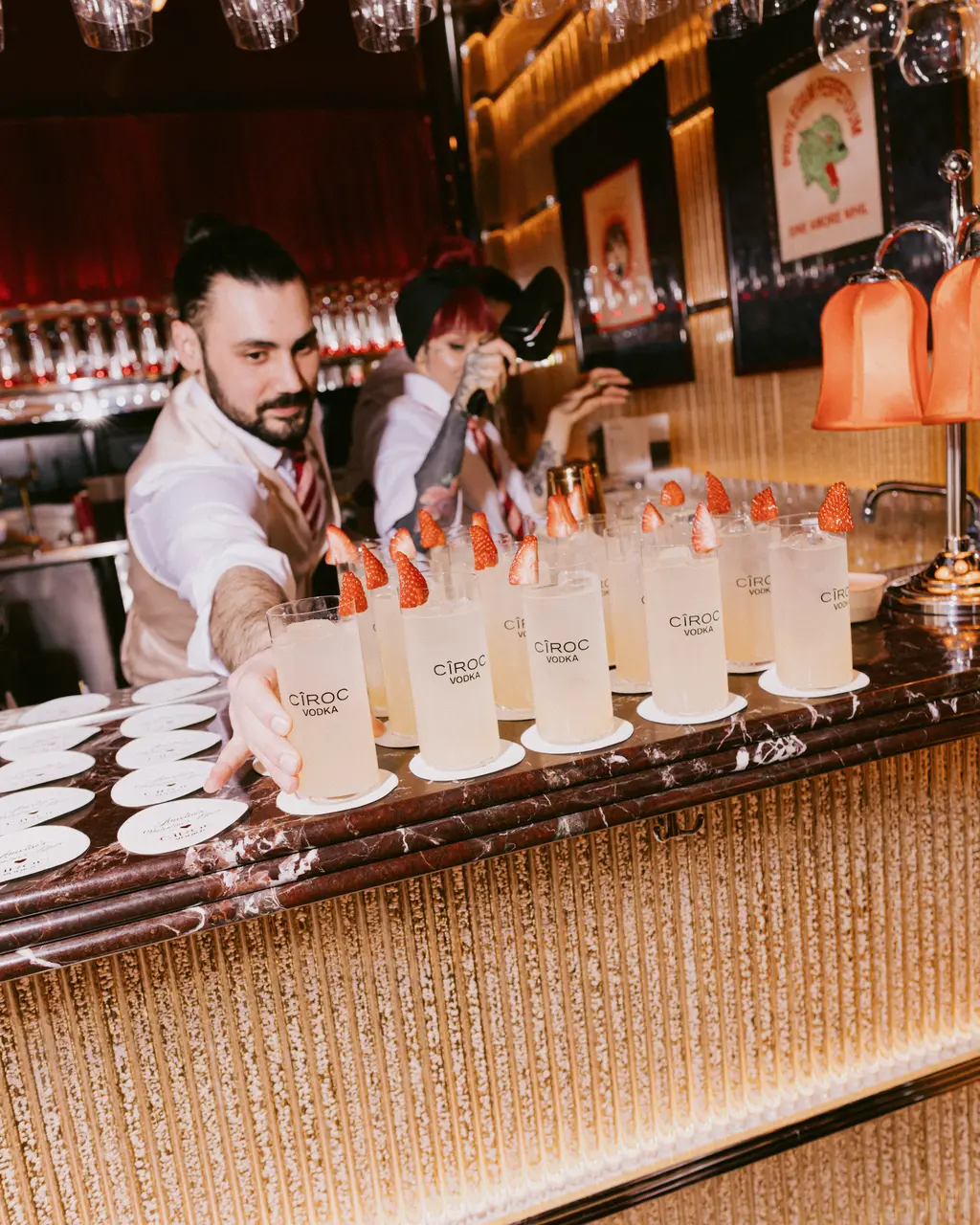 Which brings us to last night, and to Amelia’s annual Valentine’s Day party, which was every bit a picture of glorious European excess. Taking place at Carlotta, an Italian dining room in Marylebone, London, balloons lined every corner of the plush, red-hued room – even the toilet – as her nearest and dearest sipped on strawberry-topped CÎROC cocktails.