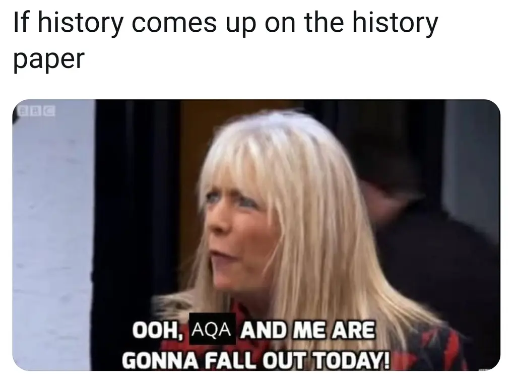 What better way to poke fun at invigilators, despair/boast about your lack of revision, or to declare exam board AQA cancelled on account of their unnecessarily difficult questions. r/GCSE, it’s all A*’s from us.