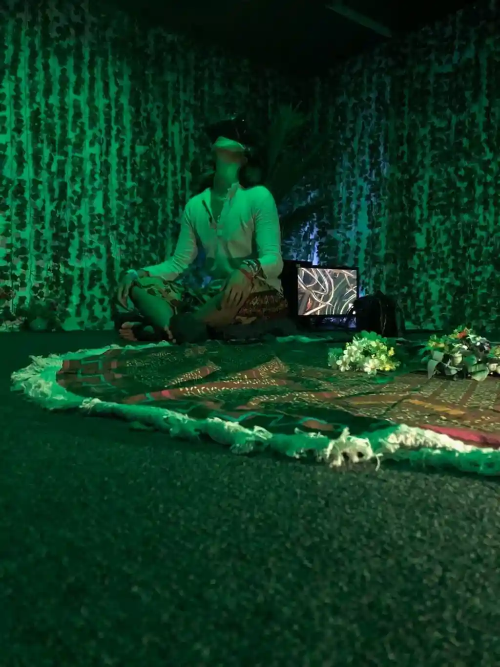 So, on a radiant Monday afternoon in July, I slipped on my hippie best (tribal print pants, sandals, and a lace-up tunic) and headed to VR World, a two-floor virtual reality emporium near the Empire State Building where Ayahuasca, Kosmik Journey was playing. The Midtown streets were swarming with tourists and suited workers, and I scurried past several glossy office buildings to arrive at the space – an enormous arcade full of blinking lights, video screens, and yelping kids lunging awkwardly in VR headsets. Walking in, my first thought was: this is the last place I would want to do ayahuasca. I was quickly ushered upstairs, to a more dimly-lit room decorated with fake vines and a floor carpet sprinkled with plastic flowers and candles. The whole set-up felt fittingly artificial, like an amusement park version of an ayahuasca ceremony. Still, there was a vibe, and when I sat down on a cushion on the floor and an employee lit some palo santo, I could feel my body relaxing.