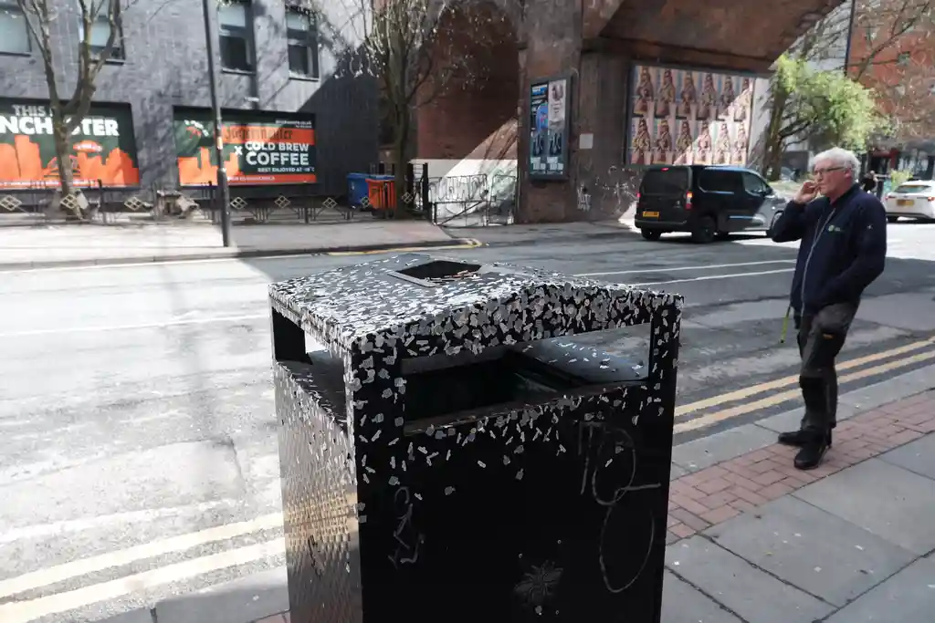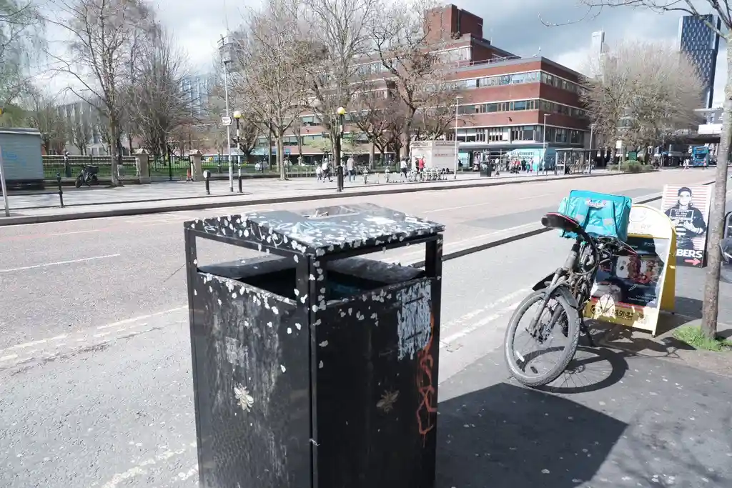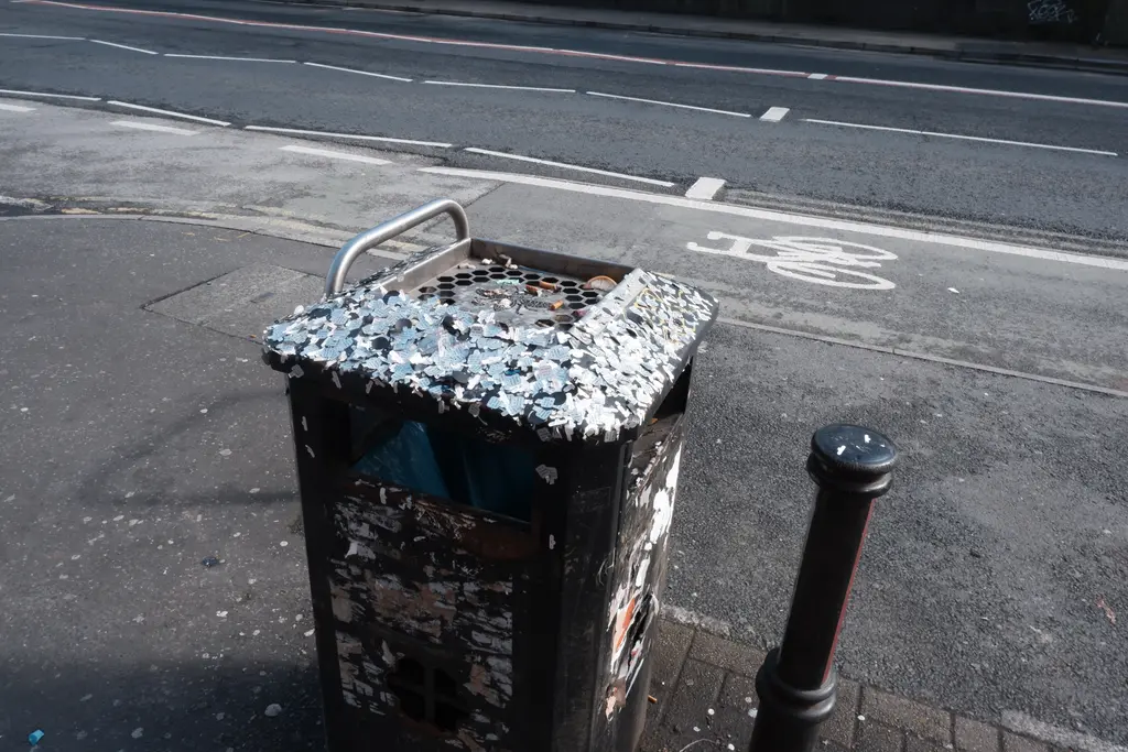 Eventually, I reach my final destination: Manchester city centre. Traversing the streets of the Gay Village, then heading into the Northern Quarter nightlife hotspot, I find many sticker-covered bins. One that stands out is opposite popular pub The Garratt, which is next to a Spar. Snapping a quick pic of the bin, I am reminded of another form of smoke-related littering as a man smokes a ciggie next to me – a handful of cigarette butts lay by my feet.