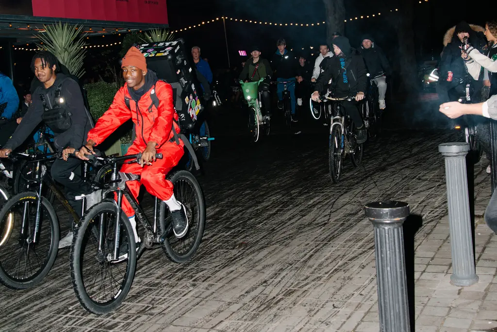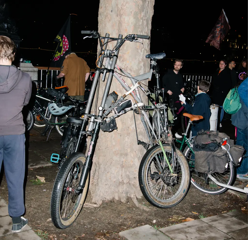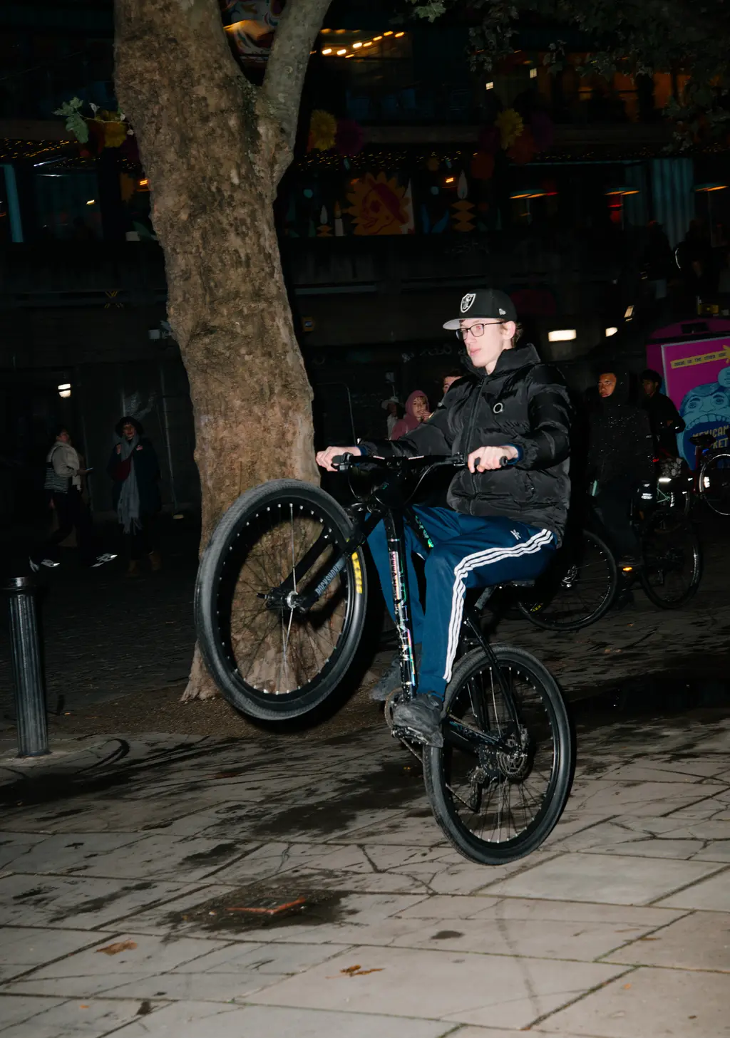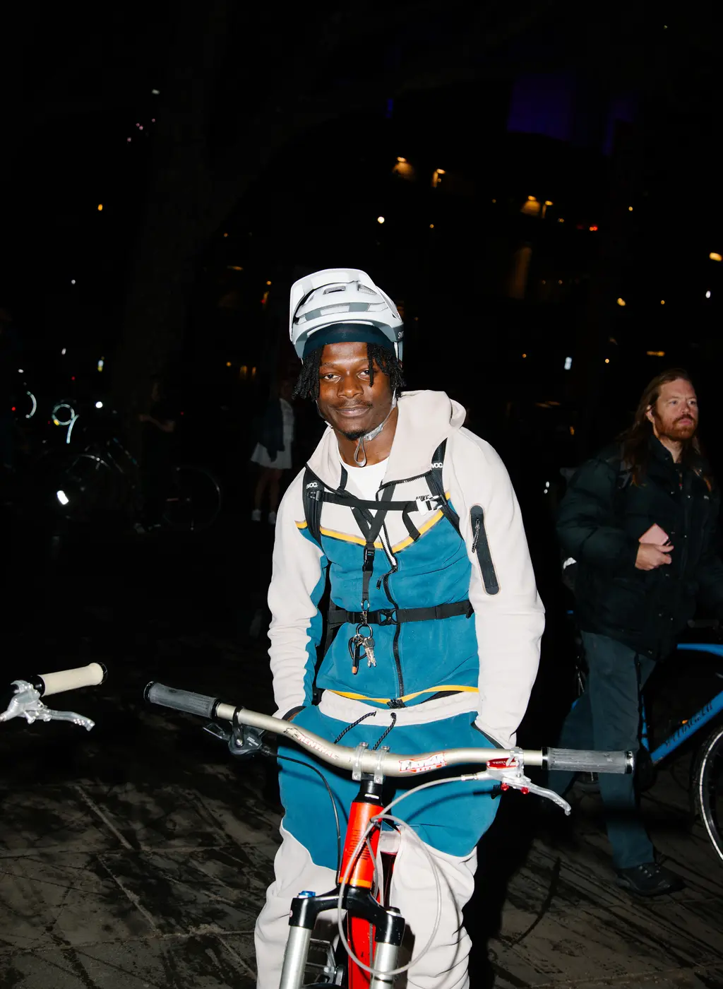 Critical Mass is a leaderless cavalcade of fixies, Choppers, Bromptons, scooters, roadsters, racers and off-duty Deliveroo riders. Founded in San Francisco in 1992 and now spanning 300 cities, the group meets on the last Friday of every month to draw attention to the ever-present dangers of cycling, providing safety in numbers to skirt traffic, pop wheelies and celebrate a central article of faith: two wheels good. Whether the pedallers in this punky peloton are there for a bit of anarchy, the environmental message or just a love of bikes, their involvement has created a thriving, whirring subculture that feels like family. Critical Mass go hard and fast, together, as London Massers – assembled for their October night-time ride-out – confirmed to THE FACE before their grand départ from under Waterloo Bridge.