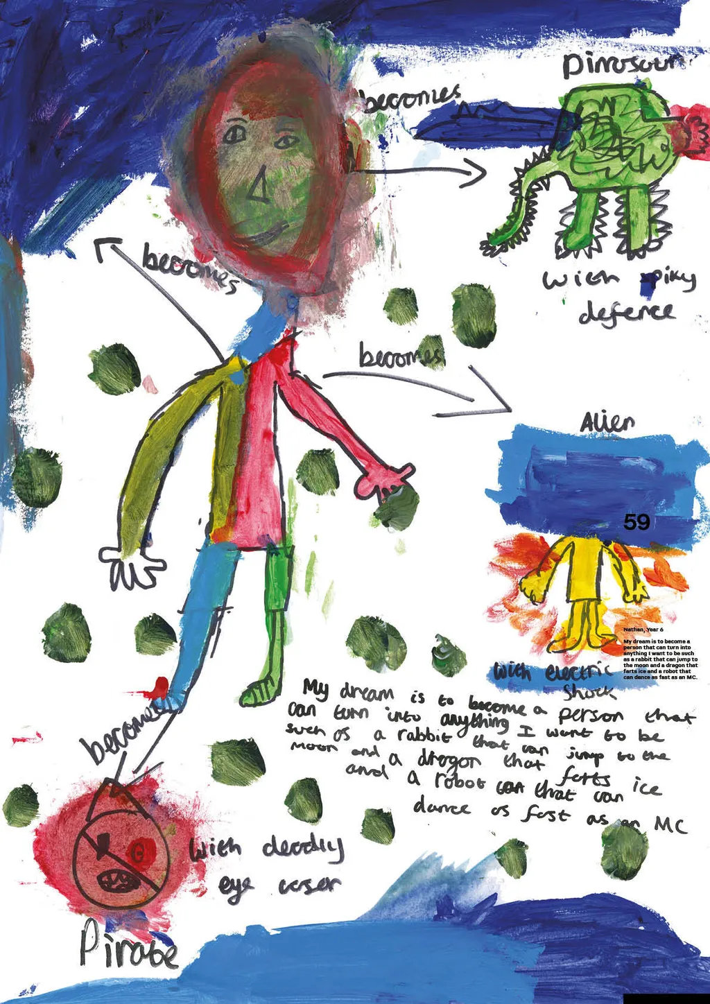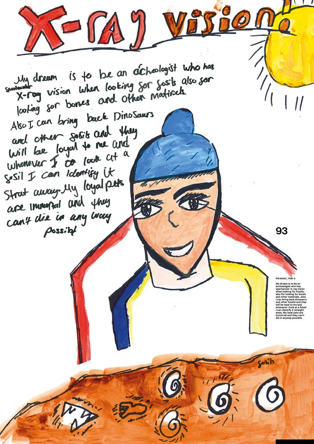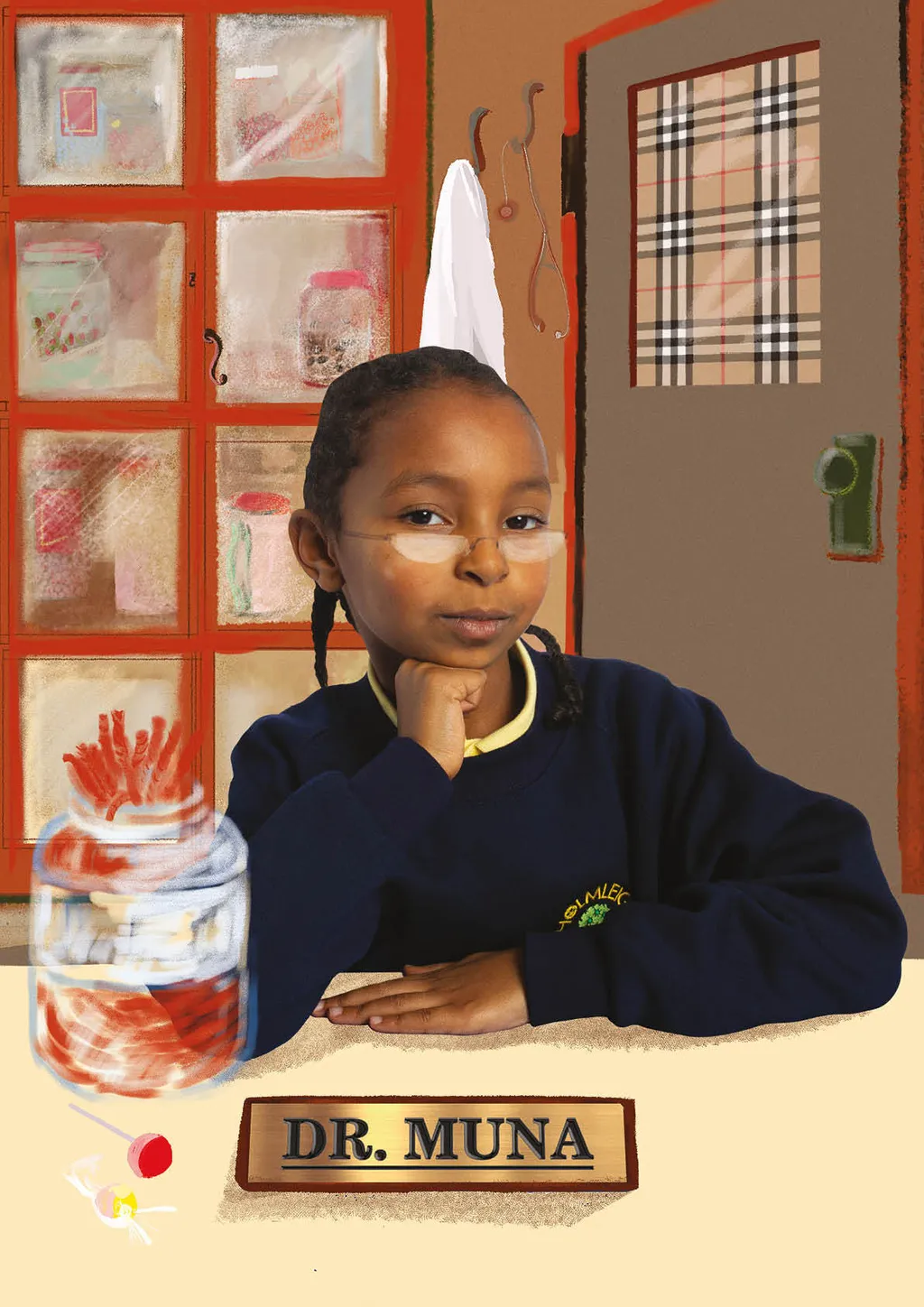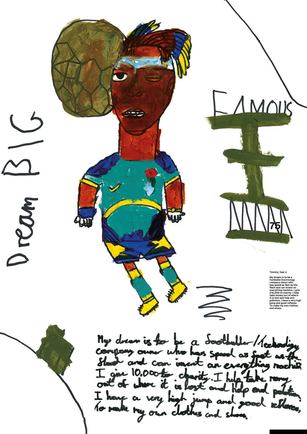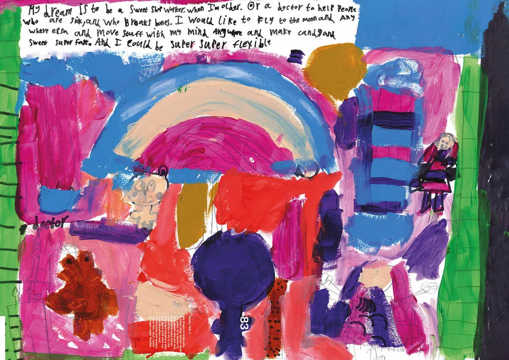 Portraiture and digital illustration bring these fantasies into vivid and often amusing reality. In one, Nathan from Year 6 imagines himself as a shapeshifter, able to transform into animals with superpowers, whilst another shows Year 3’s Muna as a doctor whose surgery doubles as a well-stocked sweet shop. Sign us up, Muna.