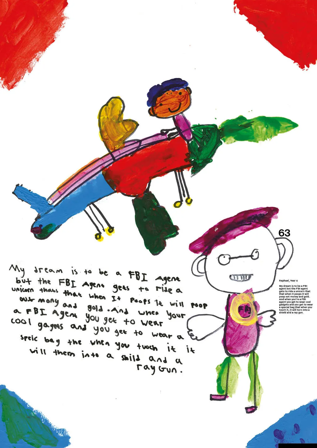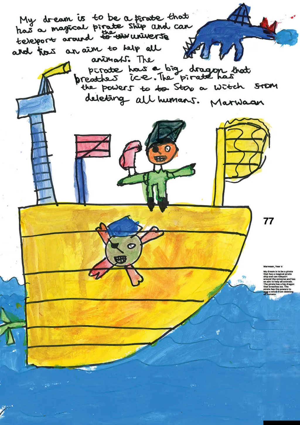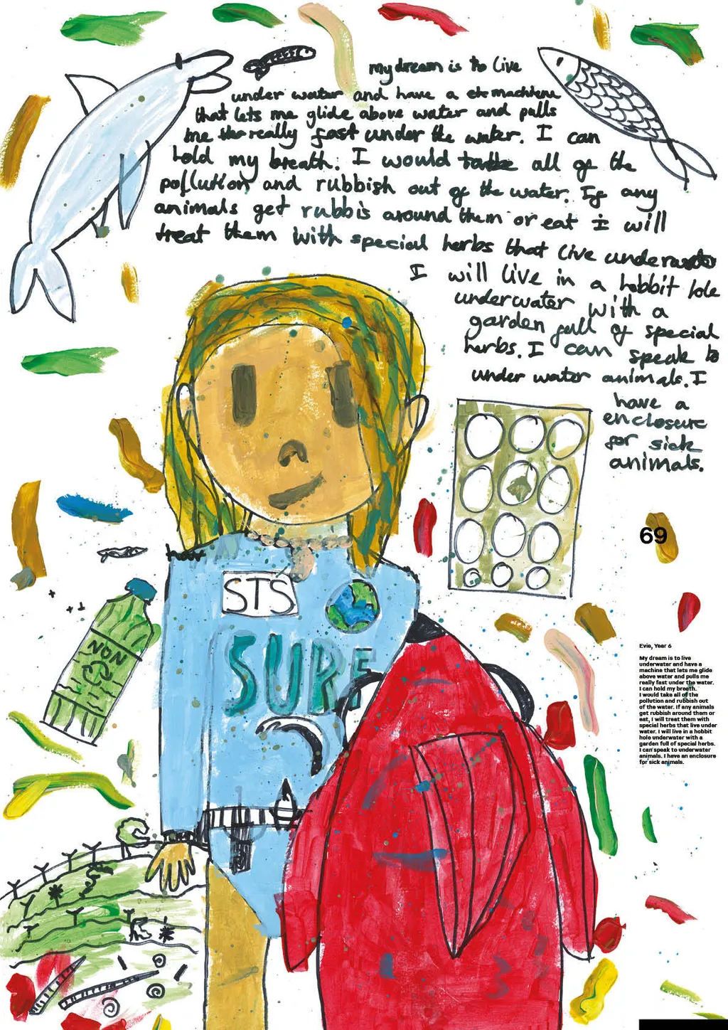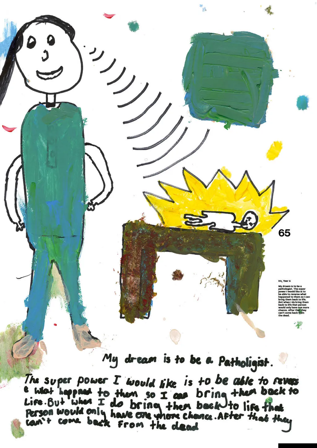 Portraiture and digital illustration bring these fantasies into vivid and often amusing reality. In one, Nathan from Year 6 imagines himself as a shapeshifter, able to transform into animals with superpowers, whilst another shows Year 3’s Muna as a doctor whose surgery doubles as a well-stocked sweet shop. Sign us up, Muna.