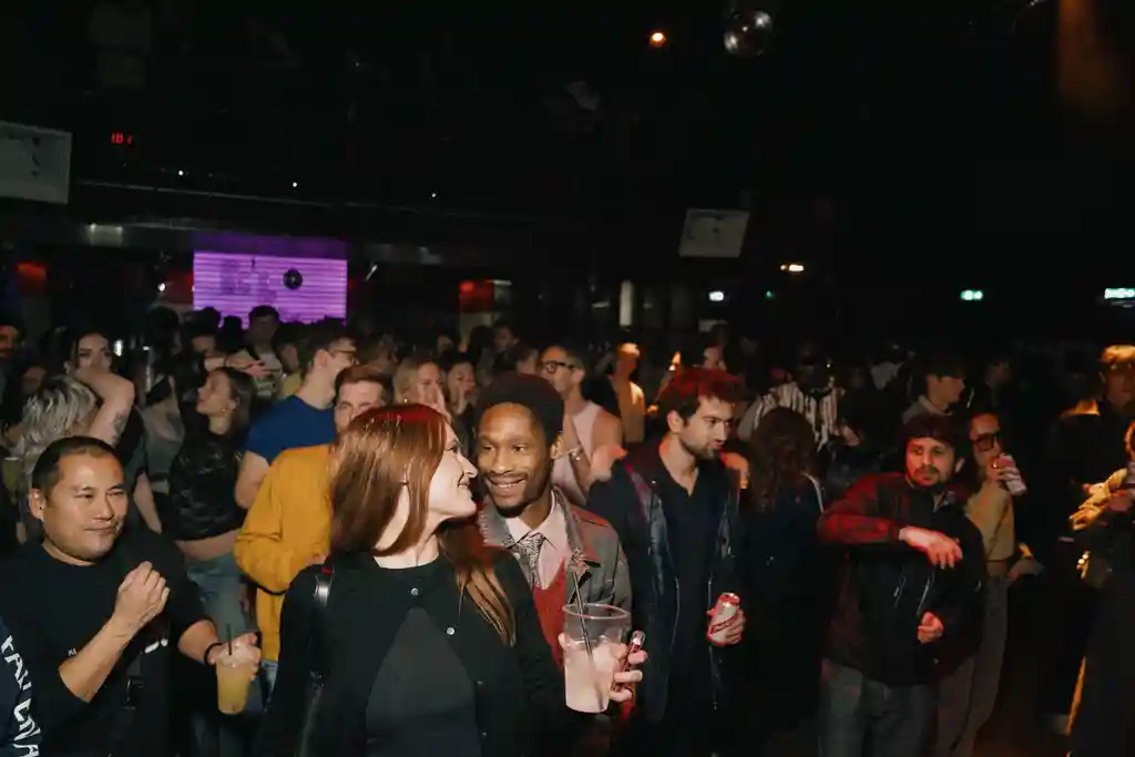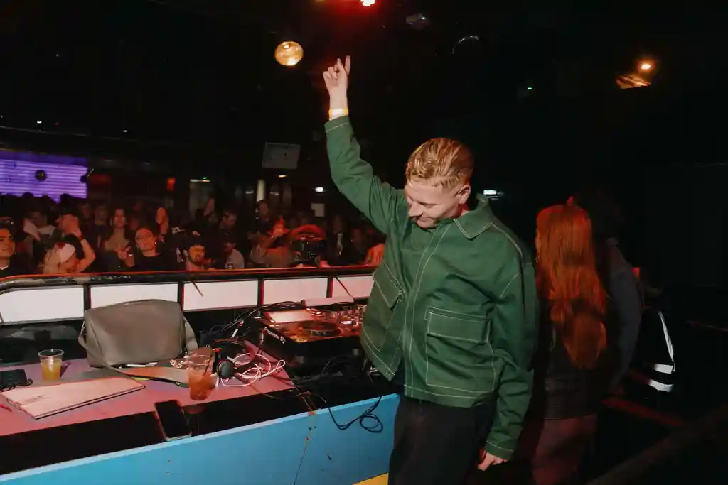 Out back, the venue’s sprawling smoking area was lit with the heaters’ roast-red hue, meanwhile wide-eyed strangers powered up on burger sliders and pints. There, we spotted producer DJ Cou Cou Chloe holding court with the night’s closing selector, Housewife 9, the two going at it in a mid-rave natter, clad in stripped-back finery. It took just one spellbinding blend of The Black Eyed Peas’ My Humps and Da Hool’s Eurodance classic, Meet Her At The Love Parade, however, to disrupt the calm, sending attendees back into the fold, many deciding to mount the stage behind the decks and throw it down on camera.
