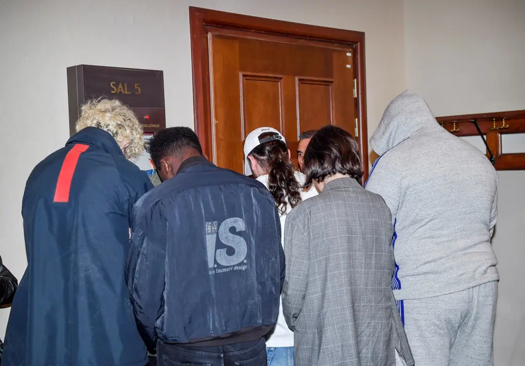 People wait outside the court room where negotiations are held against ASAP Rocky in Stockholm, Sweden, 5th July.