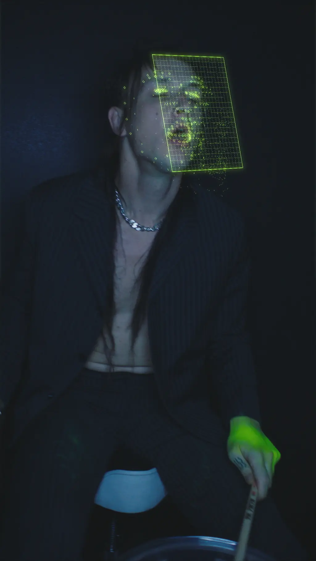 Enter the point we’re at now, in which artificial reality and government surveillance are close to crossing over in a creepy world of deep fakes. To channel that pervasive sense of unease, Ditto decided to bring in Aaron Jablonski of the digital art outfit Exit Simulation to create filters that replicated holographic face scanners. They flash across Healy’s own in the video.