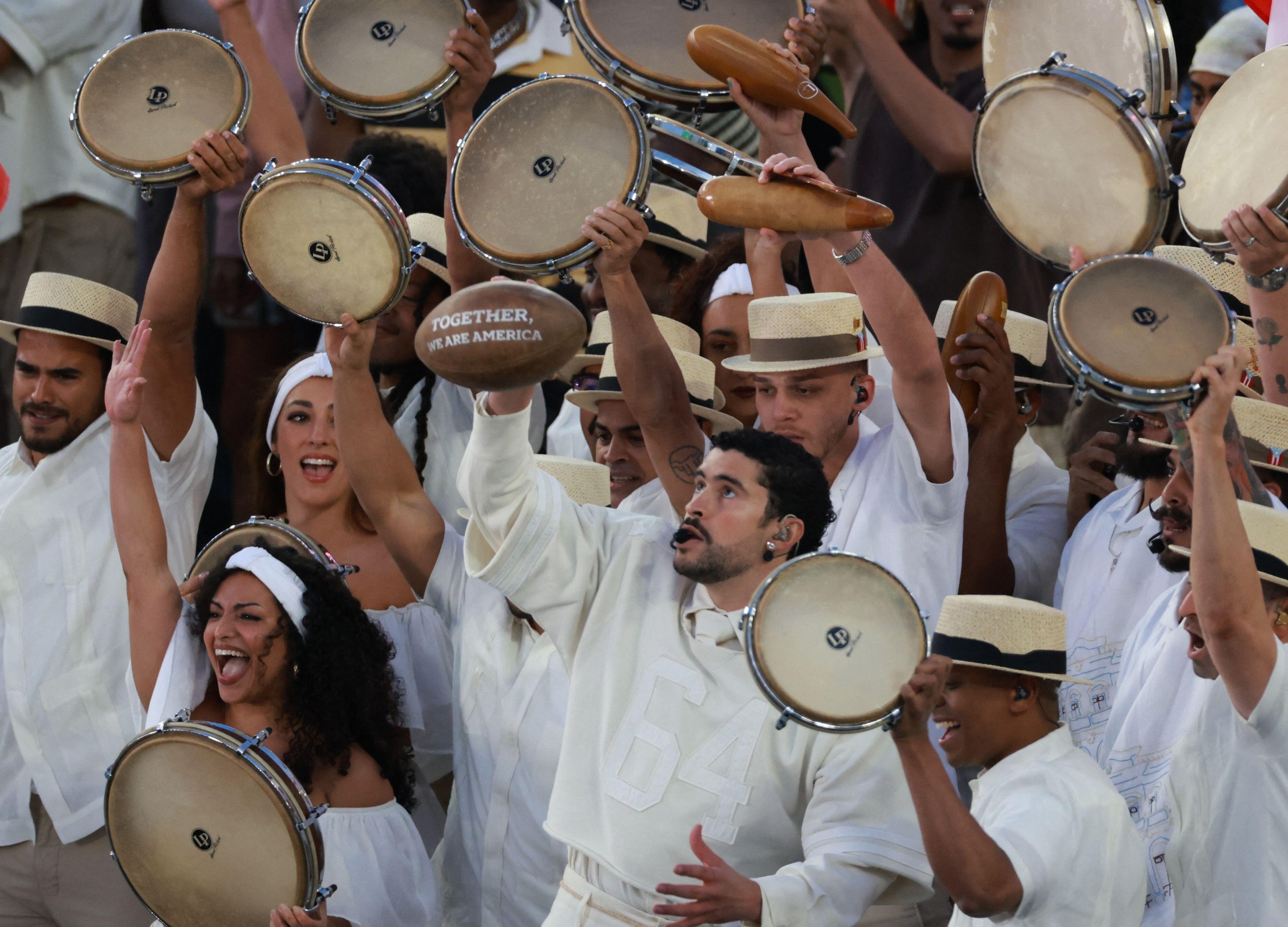 For the next 13 minutes, he teleported viewers to Puerto Rico with a set inspired by his coastal hometown of Vega Baja. Sugarcane fields framed the scene. Jíbaro dancers in pava hats moved through piragua and coco frío carts. There was a barbershop, girls getting their nails done, elders playing dominoes, kids sprinting through the set like it was a real neighbourhood and dancing everywhere. Reggaeton and dembow bled into salsa, bomba, and plena, with panderetas, güiros, maracas, and the cuatro weaving through trap beats.