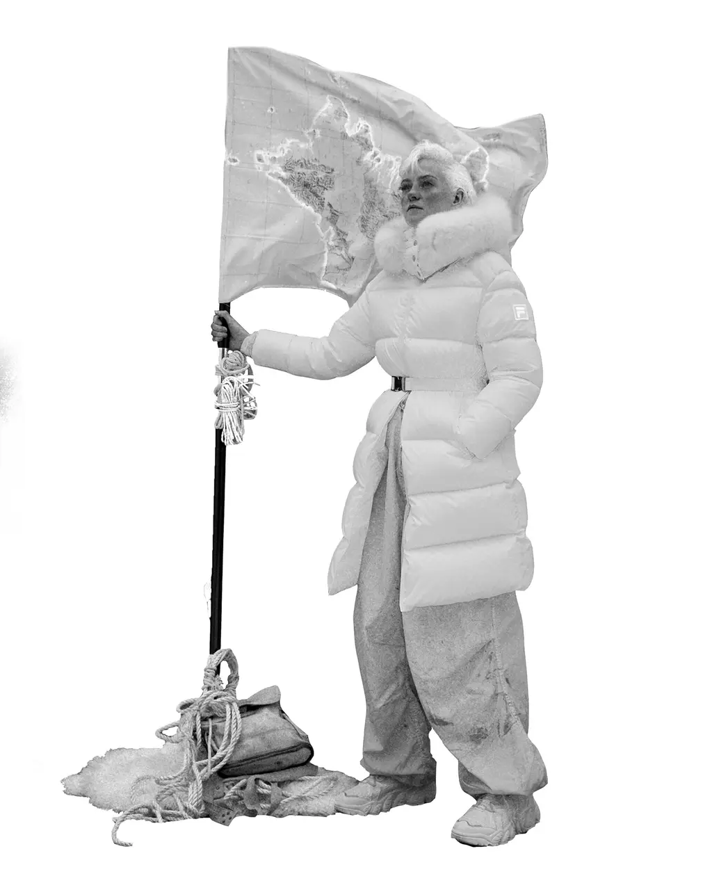 Jessica wears turtleneck, jumper, trousers and shoes FILA
