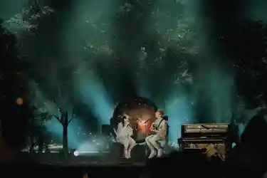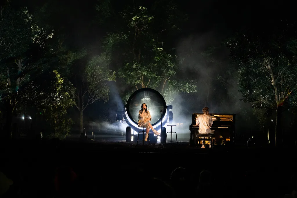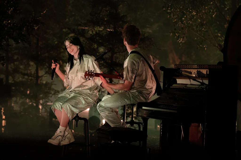 Dead on 6.30pm Billie Eilish and Finneas emerge through the trees onto the stage for an hour-long unplugged show that’s being streamed on Apple Music. Both are wearing white silky PJs with silver stick men embellishments. This is a first for them, too, an acoustic set delivered while sitting on stools.