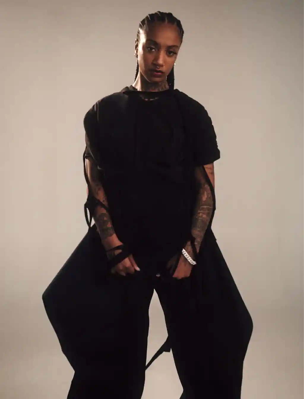 Bk learned to embrace herself after being hardened by experiences beyond her control. The clearest memory she holds from her Atlanta childhood is of being bullied intensely, “I guess for not being like everyone else,” she says. “I just wasn’t trying to dress like other n****s or talk like other n****s. I got bullied one time for wearing a hoodie and overalls.” (Ironically, she’s now making waves in the fashion world, fronting a Marc Jacobs campaign in June and walking the runway for Nigerian designer Mowalola at London Fashion Week in February.)