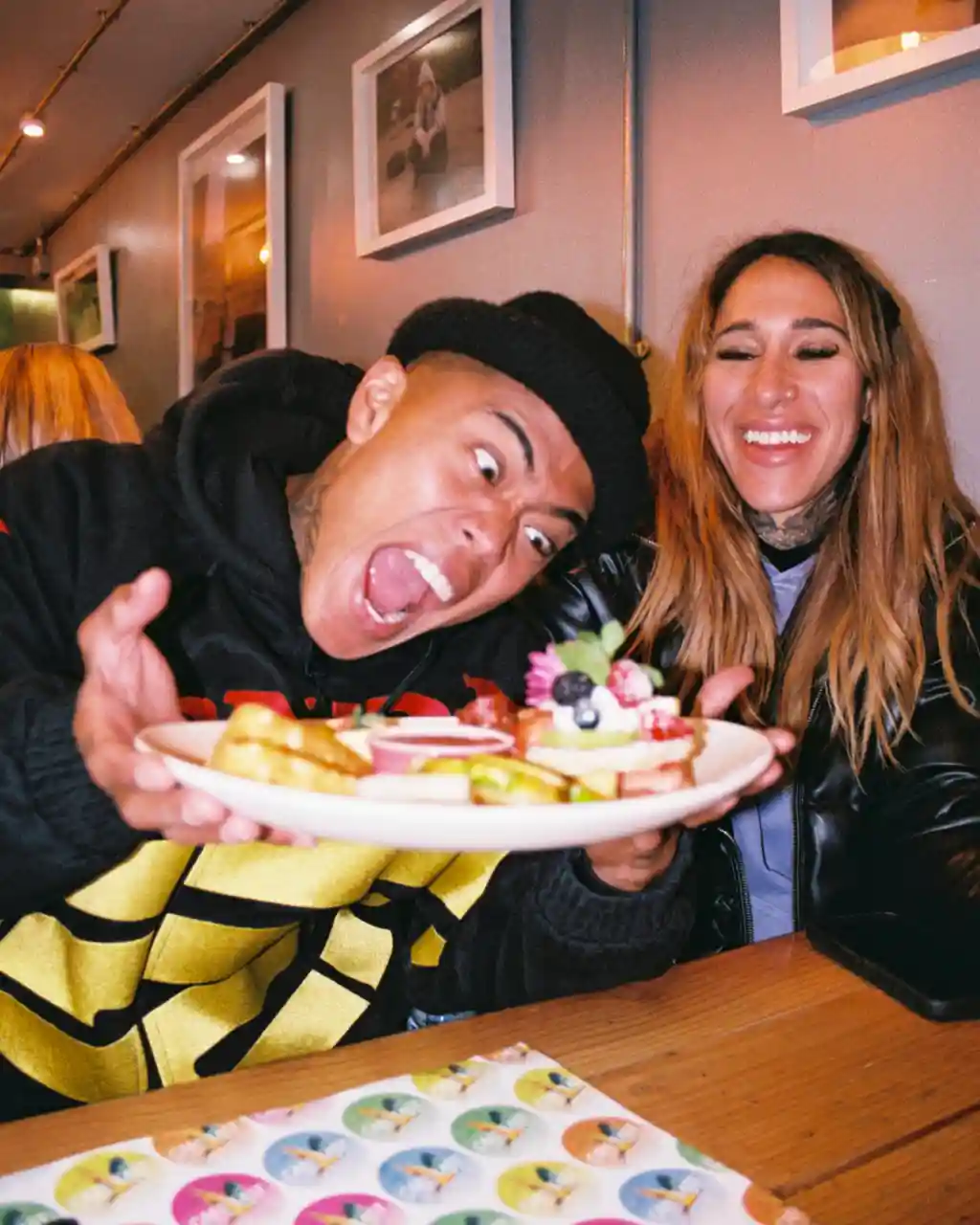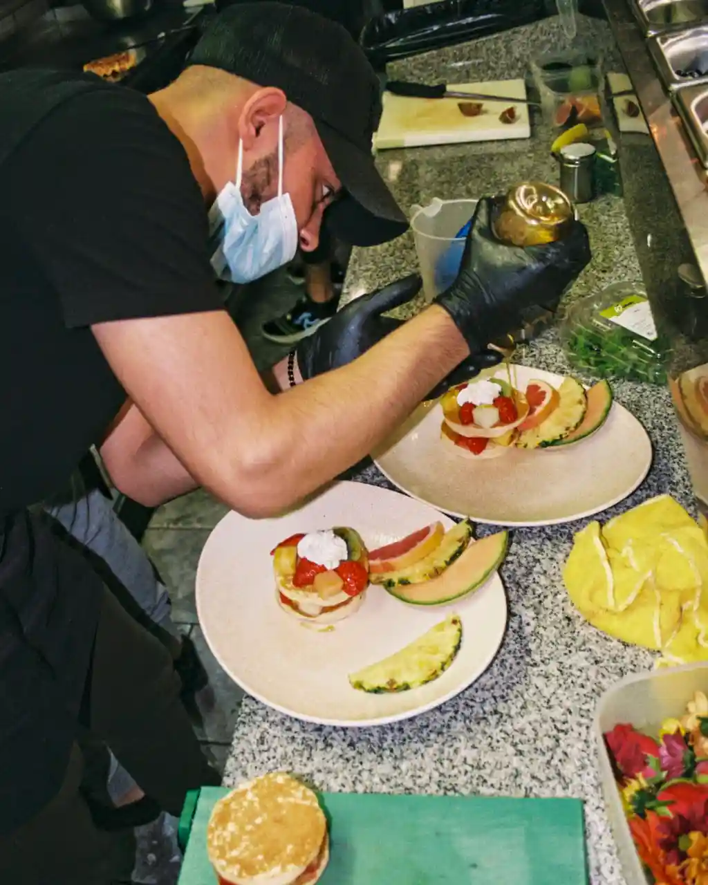 Run by Has and his brother-in-law Ali Cakan, the café is positioned snugly on Roman Road and boasts a cosy look, with a pale pink wooden front and traditional signage. It was designed with old East End pie and mash shops in mind, where you’re sat elbow-to-elbow with other patrons (the pandemic, of course, has meant spacing out their previously intimate tables). It serves traditional caff and brunch food, but presented immaculately – hash browns and scrambled eggs are plated up with exotic fruit and edible flower arrangements. Has, 32, has a background in graphic design, and this is central to his care for how the food looks: “We never let one plate leave the kitchen unless it looks ten out of ten, even if it’s, like, the last plate of the day.”
