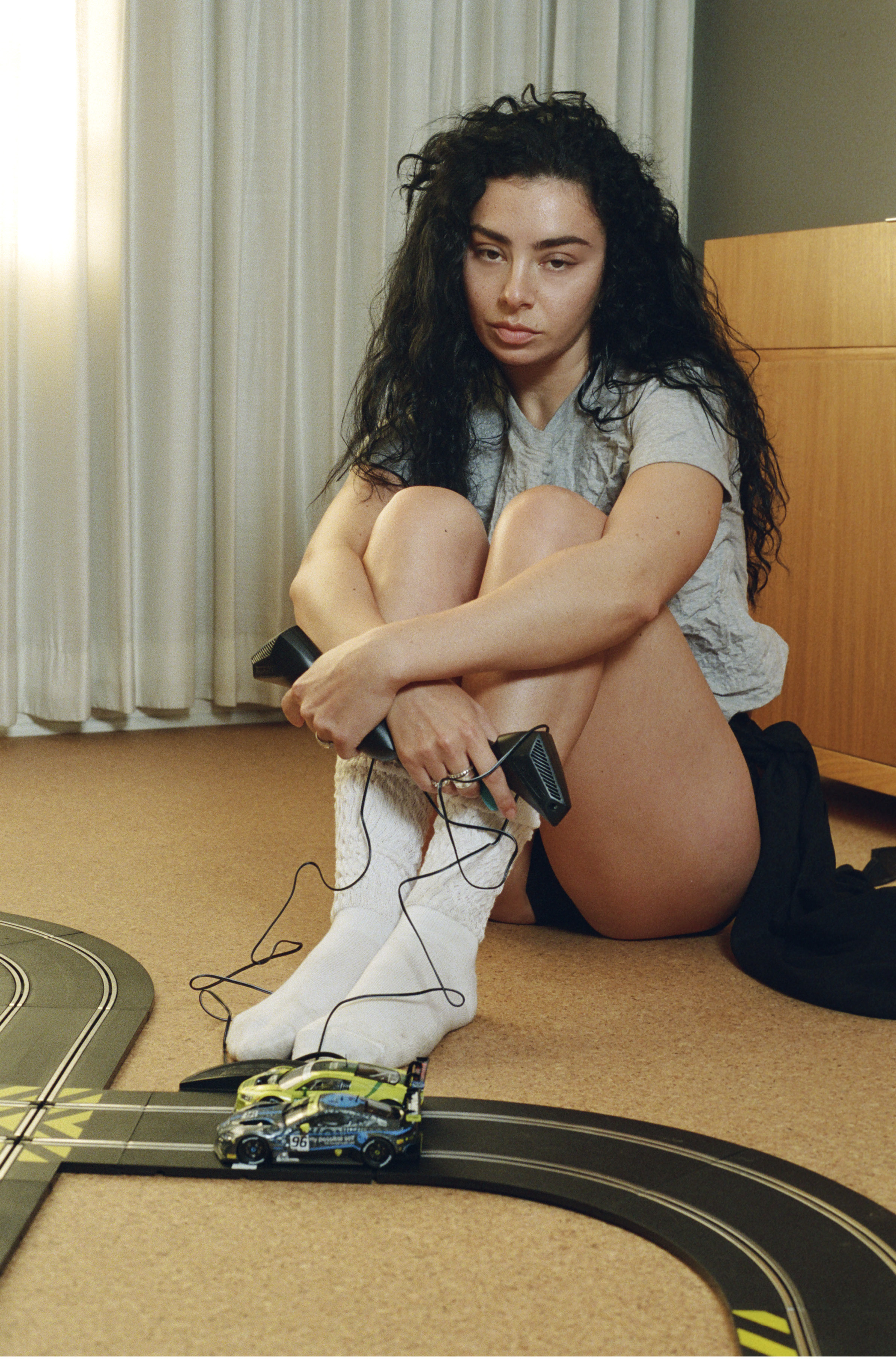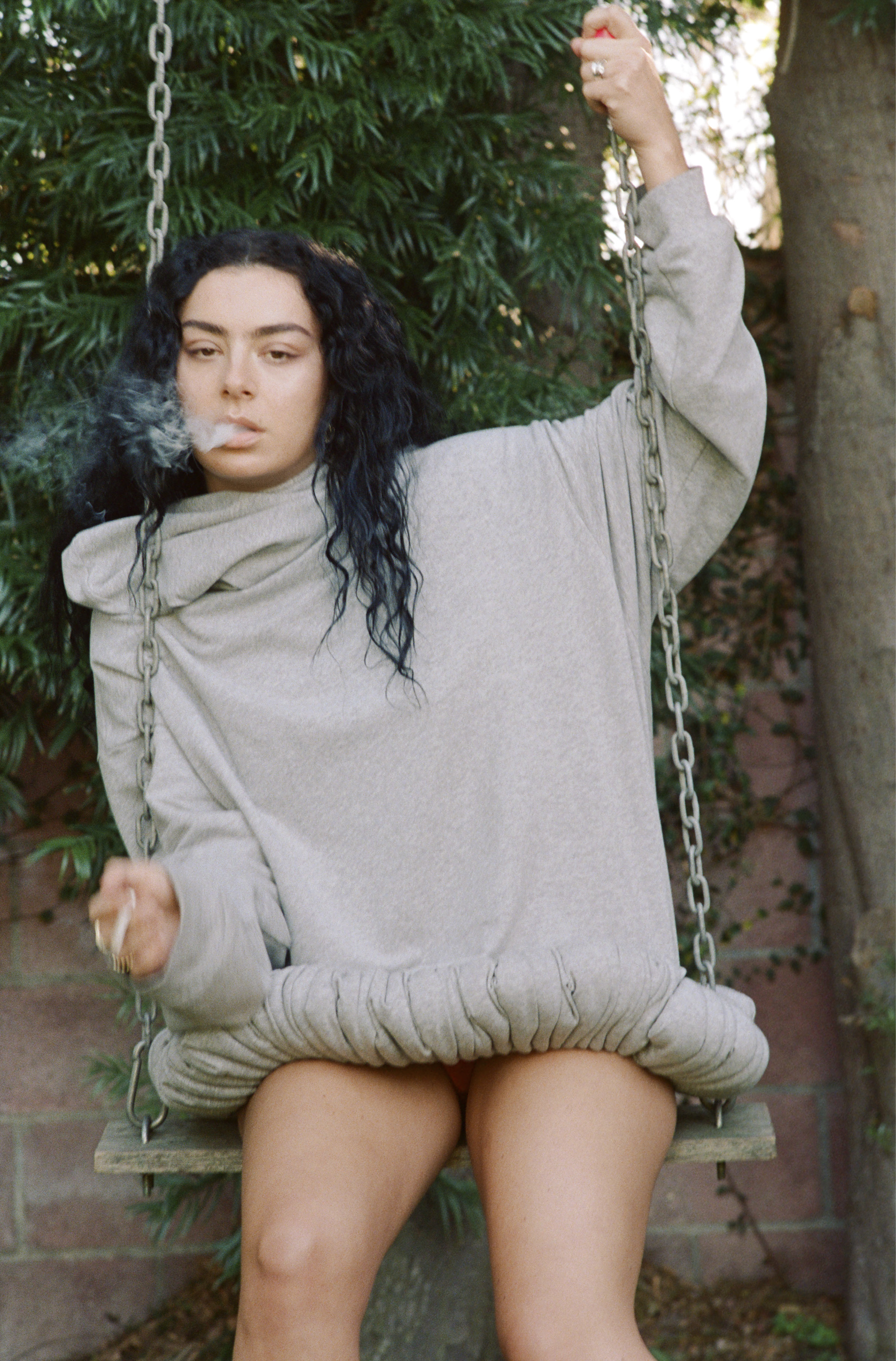 Charli was raised on spunky, fearless music like this. Growing up, she loved Lily Allen, who “was outspoken and ran her mouth, and had the songs to back it up. She was a fully- formed, flawed person.” She still finds that archetype attractive. “I remember my dad saying: ‘You know, Charli, you should be like Tom Hanks. He has a reputation for being nice,’” she recalls. “And I was like, yeah, but I don’t know that people think Tom Hanks is cool.”