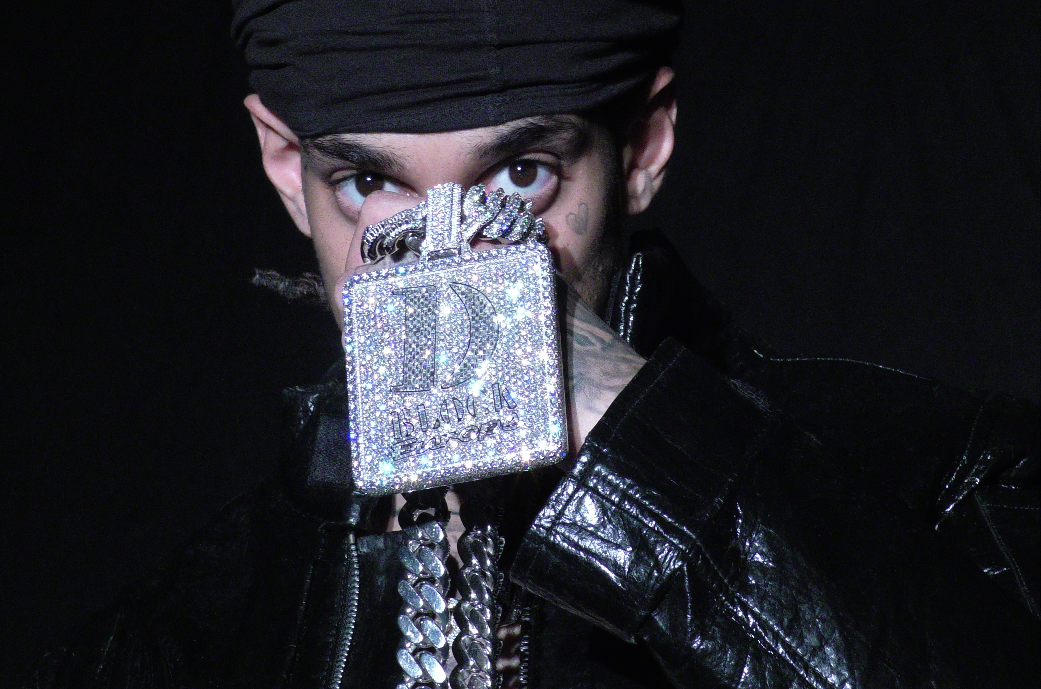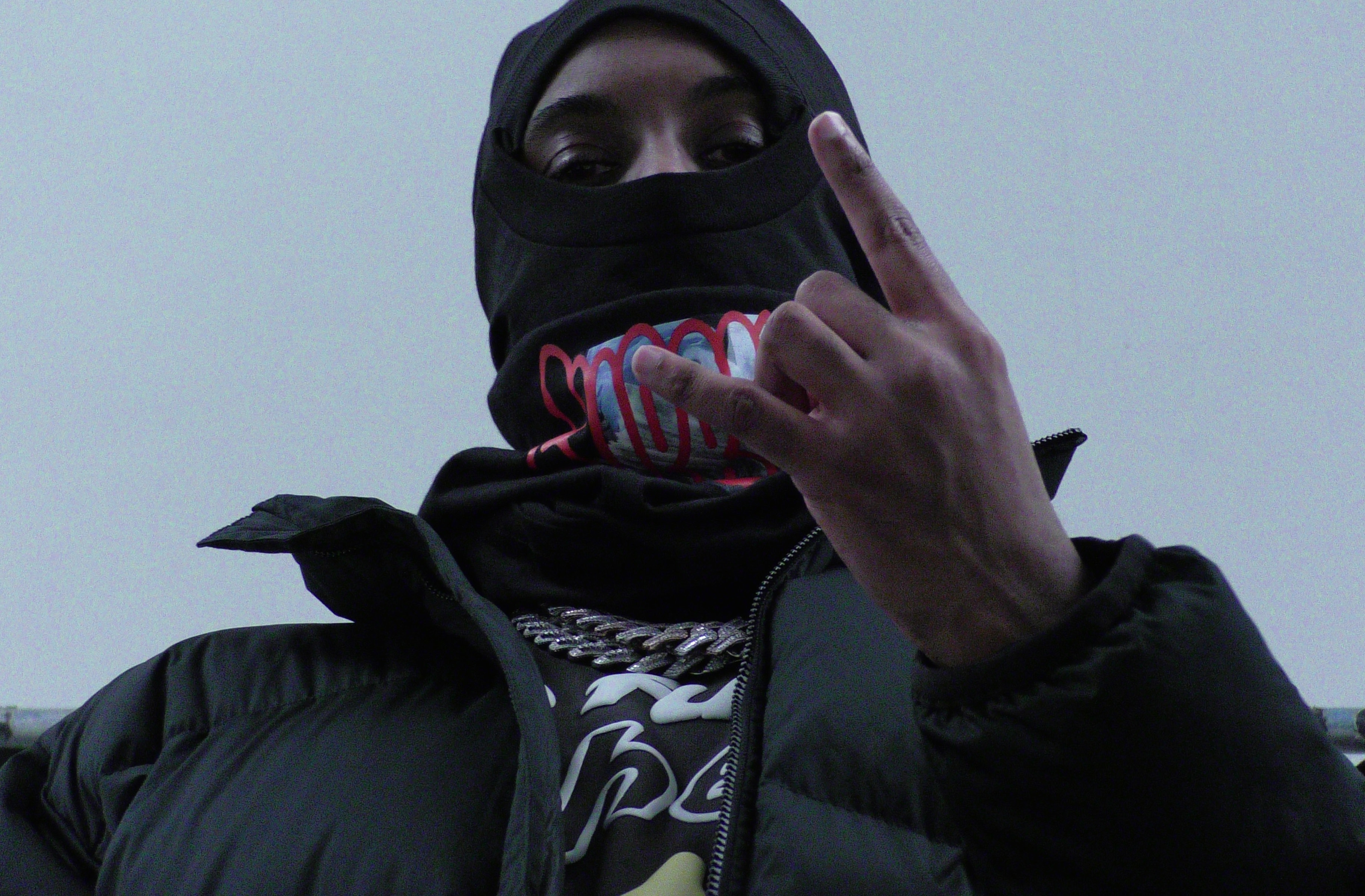 Dirtbike LB wears jacket NIKE and durag and jewellery talent’s own