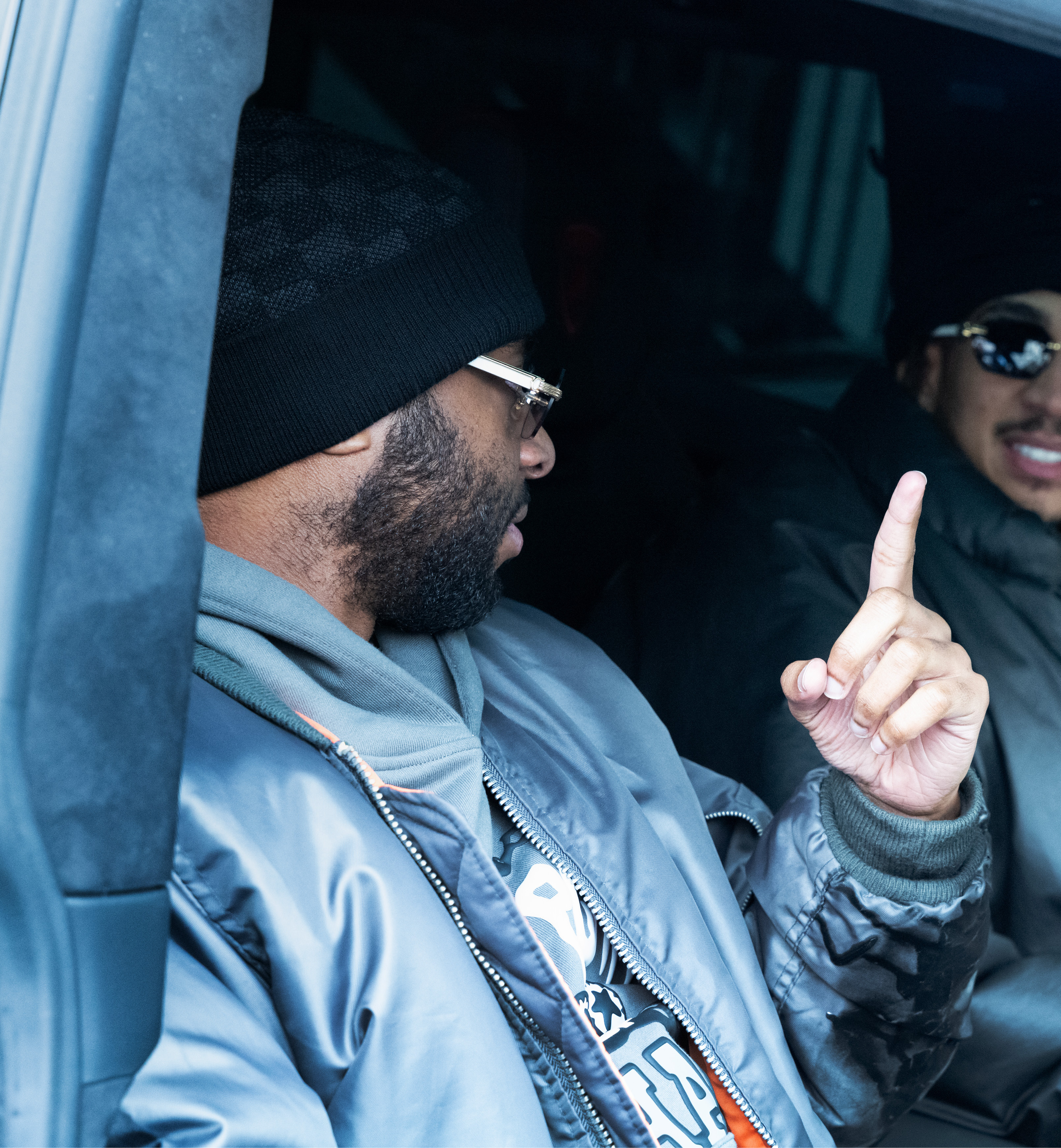 Dirtbike LB wears jacket stylist’s own and hoodie, hat and sunglasses talent’s own