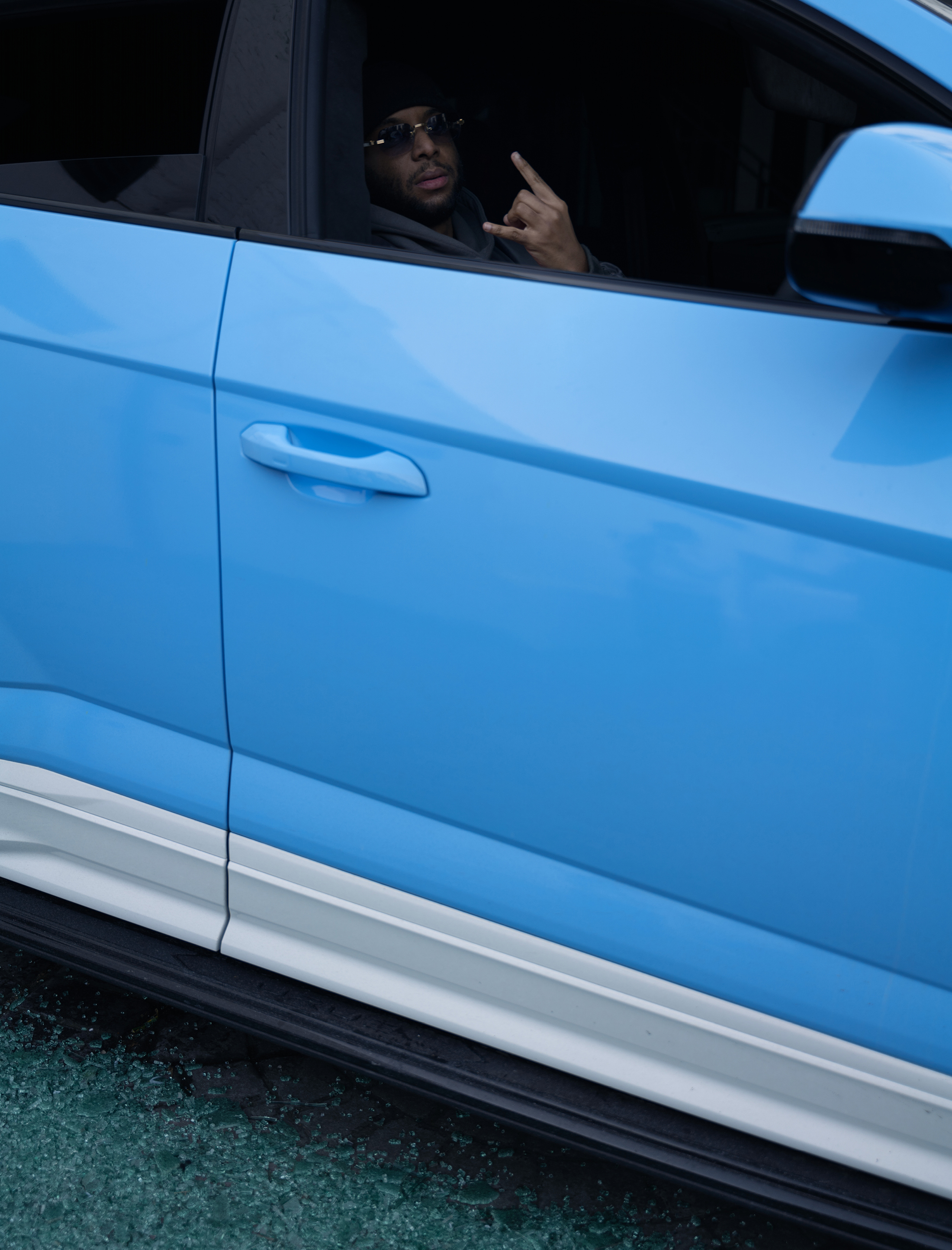 Young Adz wears jacket NIKE and hat, sunglasses and jewellery talent’s own