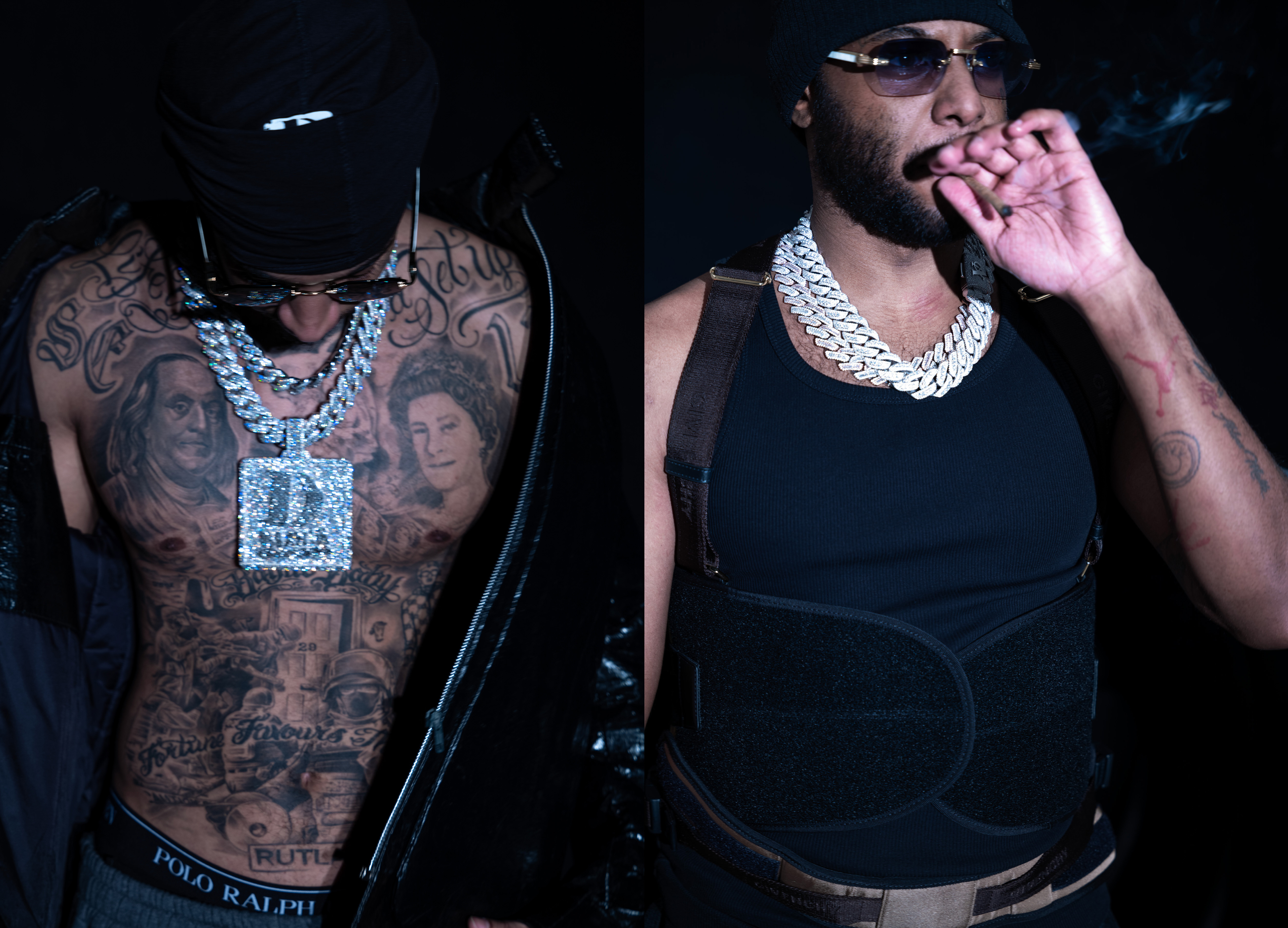 Young Adz (left) wears jacket archive HELMUT LANG courtesy of LA NAUSÉE, trousers Y/PROJECT and hat, sunglasses, jewellery and underwear talent’s own Dirtbike LB (right) wears top and harness GIVENCHY and hat, sunglasses and jewellery talent’s own