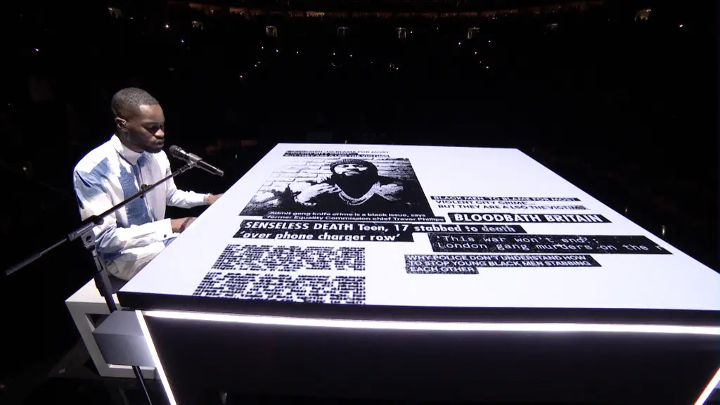 Bronski: The previous performance with Dave at the BRITs was very much all about the lyrics, but there was an Easter egg in there that unfortunately got missed by the camera. We were projecting content on his piano and, at one point, there was an avocado. That was referencing his line about Kate Middleton and Meghan Markle [“how the news treats Kate versus how they treat Meghan”], and the way the press reacted differently to them eating avocados.