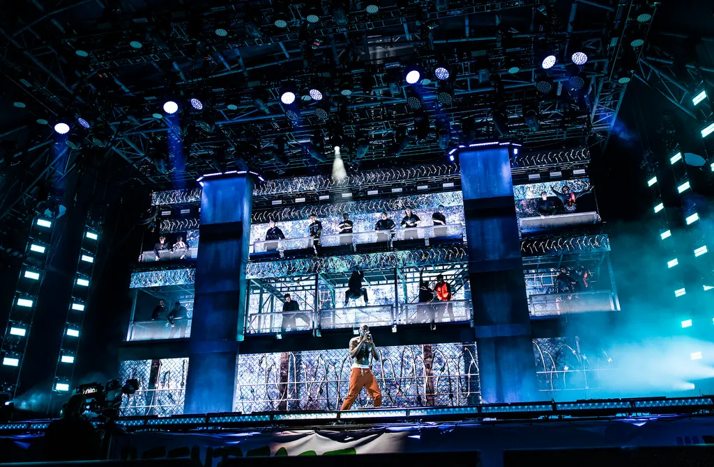 Bronski: Dave really wanted everyone to have their own moment, so even though they’re all together on stage, everyone had their thing. Dave started off by a little bonfire; Fredo started off in the middle with all the fire turning on; Meekz started off sitting on one of the set-pieces; Ghetts started at the back of the fire with the choir, and Giggs started on a platform full of lights. Each person had their own cool opening position, which is something Dave definitely wanted.