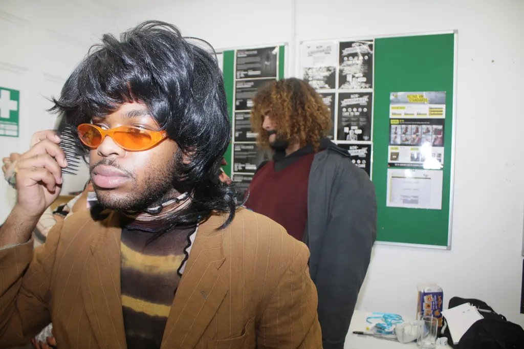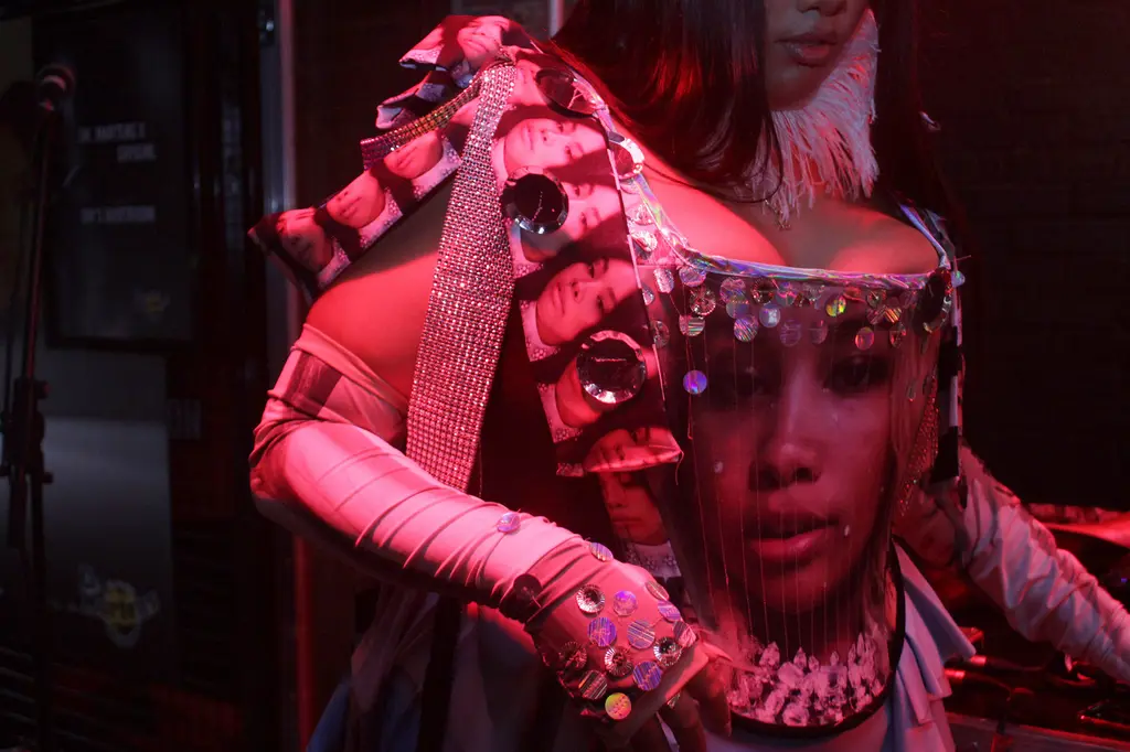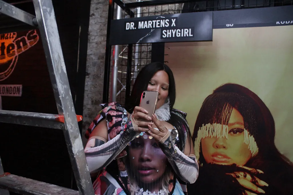It takes a certain kind of energy to work a dress that’s made with blown-up pictures of yourself, and it’s the kind of energy that Shygirl exudes by the bucketload. At a packed out gig at The Boot Room, Dr. Martens’ intimate music venue in Camden, south London’s Blane Muise aka Shygirl glistens on stage in her very own suit of armour — her most liked selfies on Instagram. Her look comes courtesy of friend and designer Max Allen, accessorised with a feathered collar, satin gloves that go over the elbow, shimmering eyeshadow and long pink nails. She pairs the dress with black platform DMs (the Jagger model), because, as she says when we chat over the phone, “You know, I like to be a bit taller than everyone else.” Once her show begins, Shygirl sashays across the stage brandishing a huge fan, and custom Shygirl fans are handed out to the clamouring crowd.
