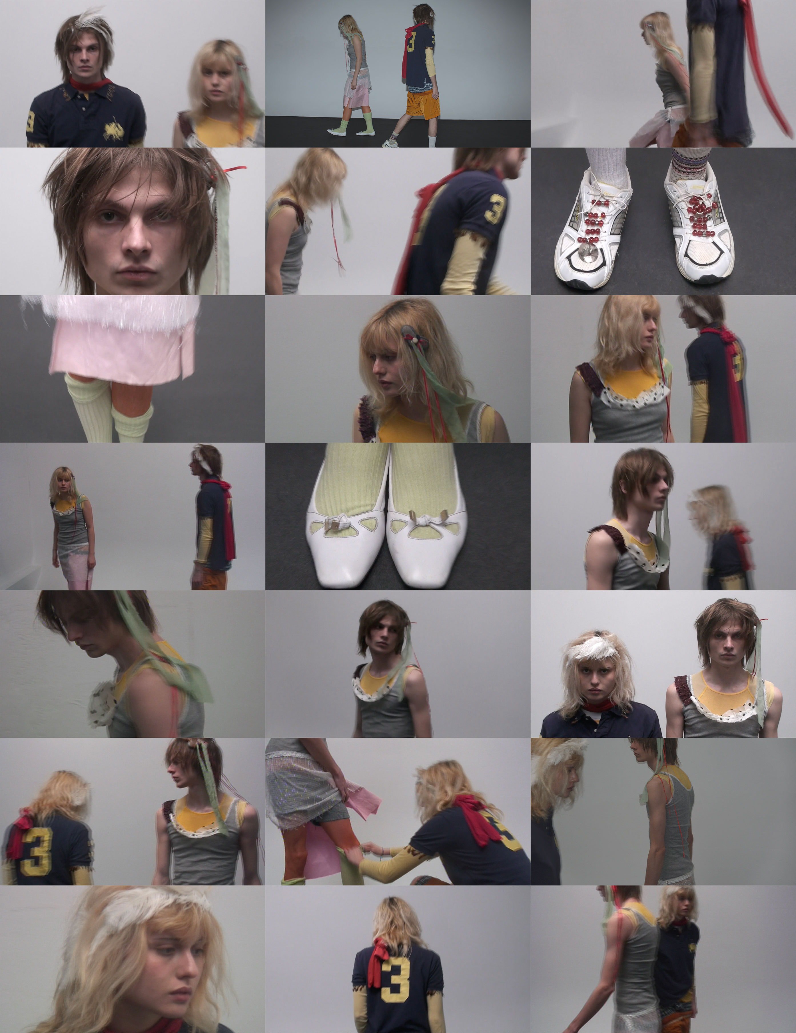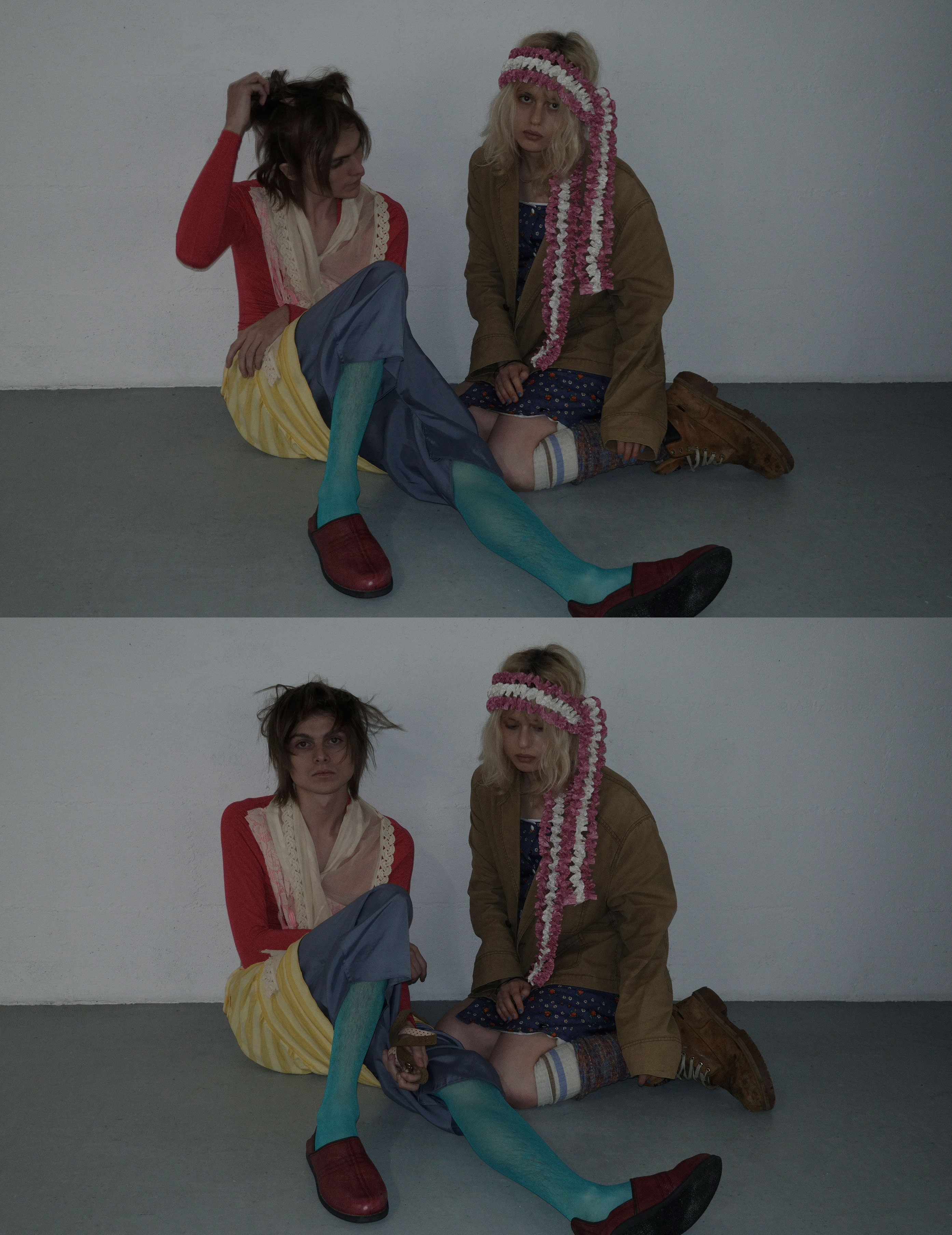 Jonah and Yaelle wear T-shirt AHIMSA, top (worn underneath) BASERANGE, shorts C.P. COMPANY, shorts (worn underneath) CARHARTT WIP, socks talent's own, custom shoes and scarf stylist's own, dress CLEVER DISGUISES top and socks BASERANGE, custom hair clip, tights and shoes stylist’s own