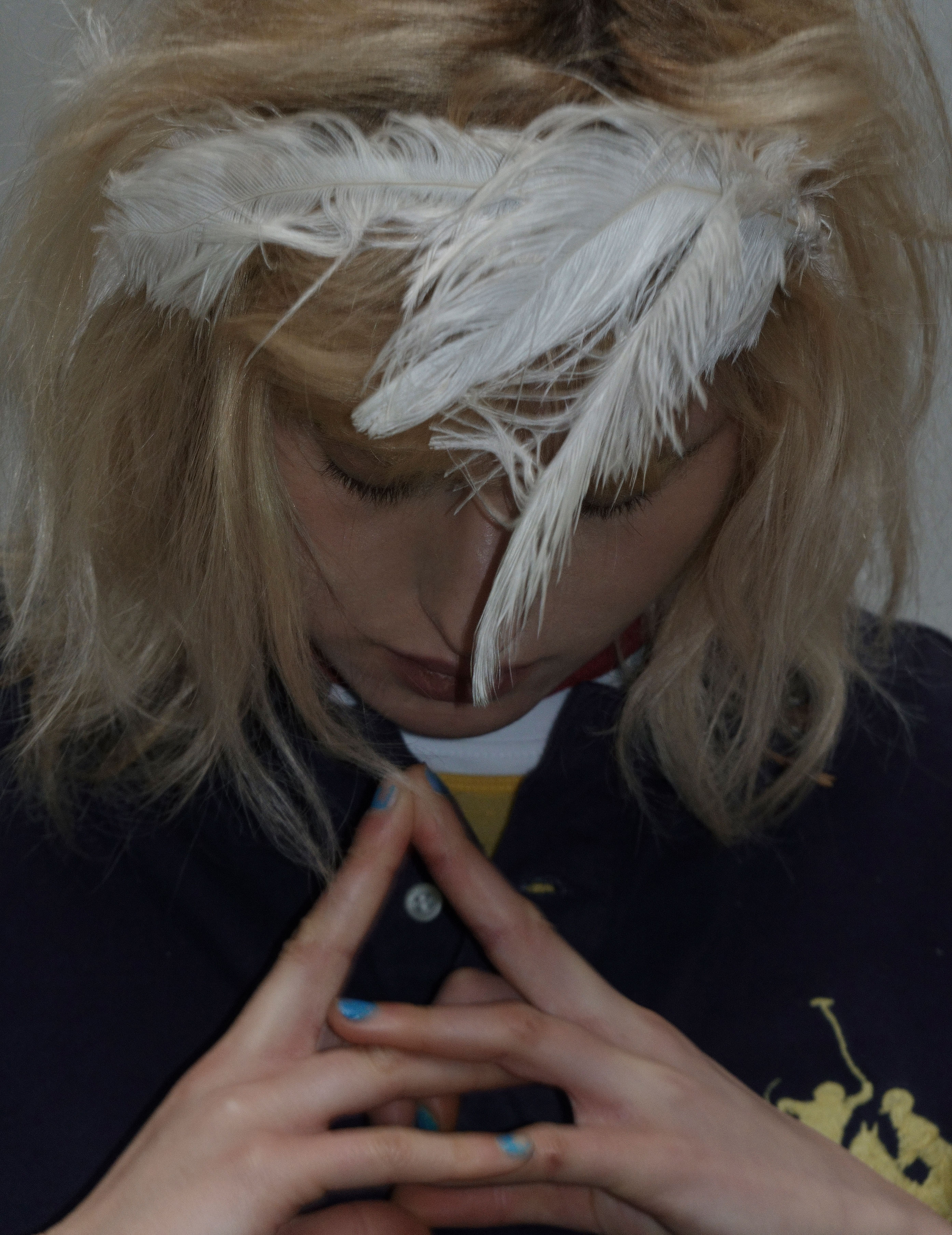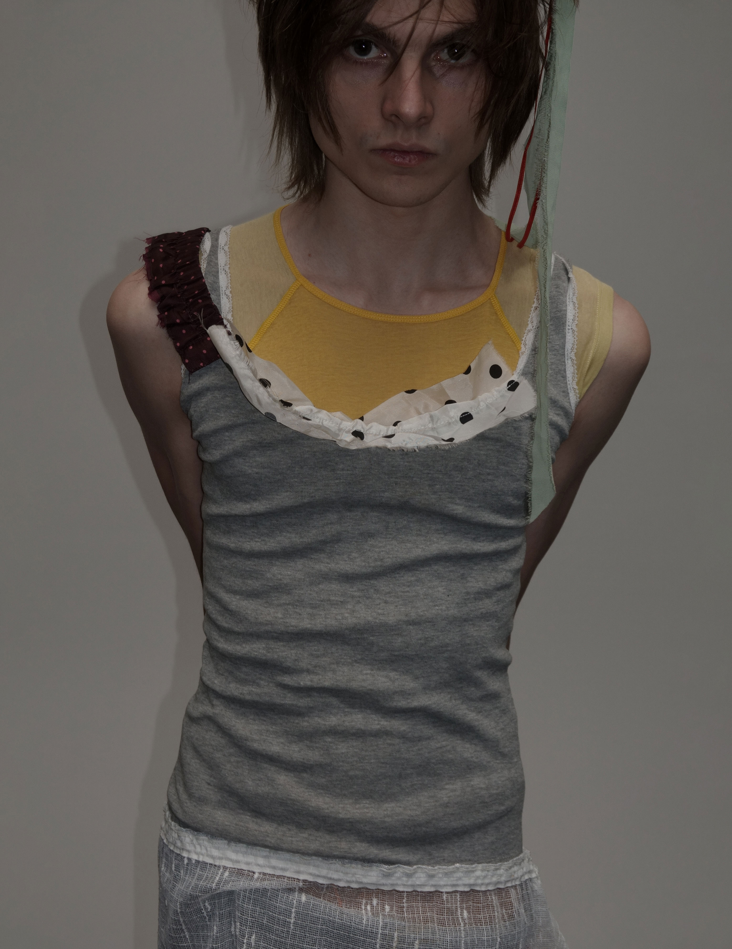 Jonah wears T‑shirt AHIMSA, top (worn underneath) BASERANGE, shorts C.P. COMPANY, shorts (worn underneath) CARHARTT WIP, socks talent’s own, custom shoes and scarf stylist’s own, dress CLEVER DISGUISES top and socks BASERANGE, custom hair clip, tights and shoes stylist’s own