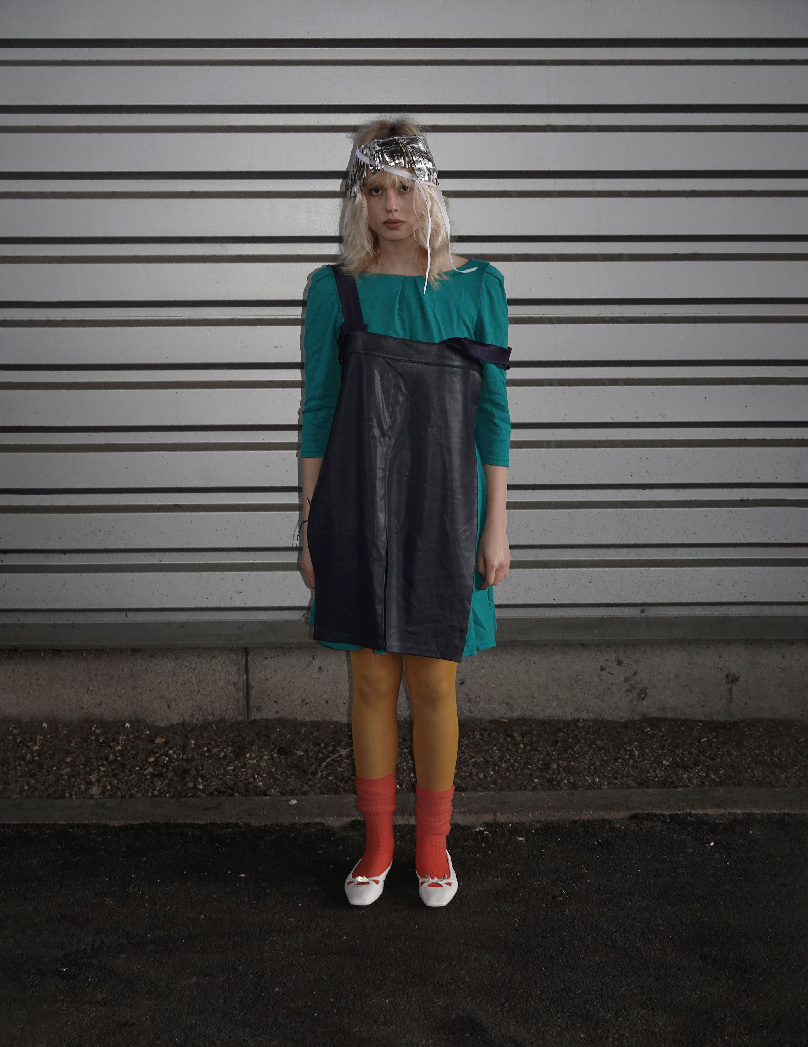 Yaelle wears T‑shirt AHIMSA, top (worn underneath) BASERANGE, shorts C.P. COMPANY, shorts (worn underneath) CARHARTT WIP, socks talent’s own, custom shoes and scarf stylist’s own, dress CLEVER DISGUISES top and socks BASERANGE, custom hair clip, tights and shoes stylist’s own