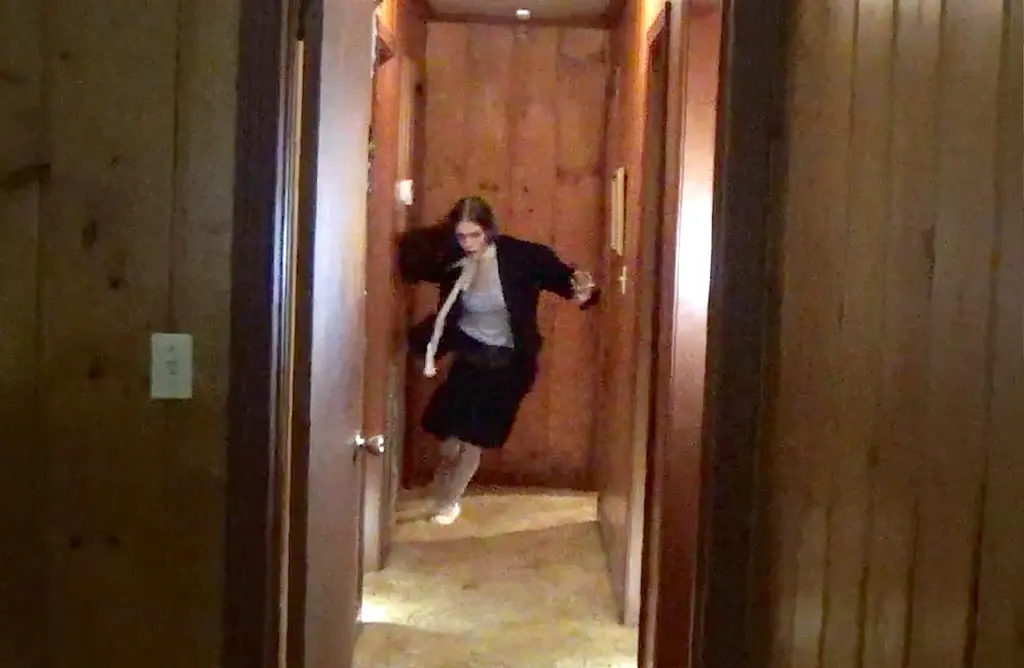 Ethel wears jacket, top, jumper, skirt, belts, socks, shoes and underwear MIU MIU and stickers stylist’s own