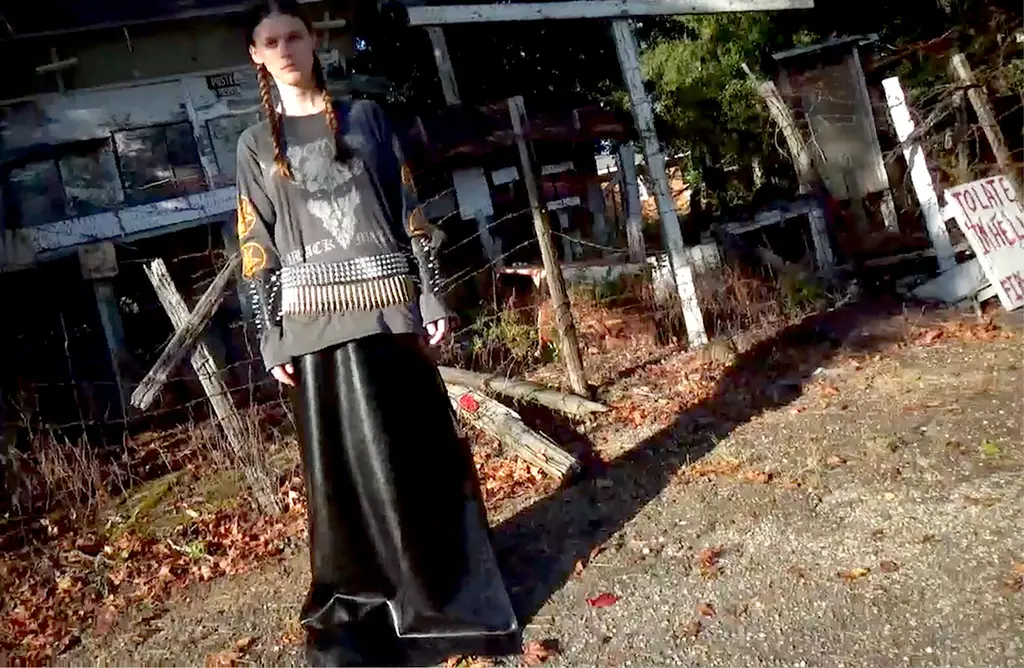 Ethel wears jacket ALEXANDER MCQUEEN, top, skirt and shoes BALENCIAGA and arm cuffs R&M LEATHERS