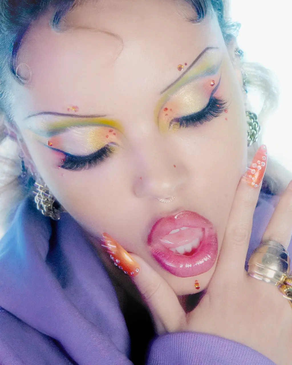 FKA twigs wears hoodie PALACE, rings HANNAH MARTIN and earrings BENTLEY AND SKINNER