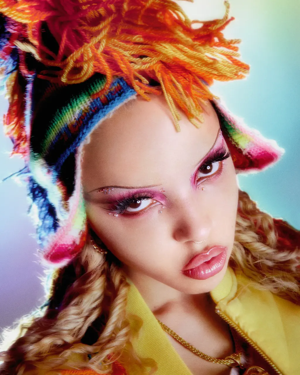 FKA twigs wears hat DIOR BY JOHN GALLIANO FALL 2002 at MR STEVEN PHILIP STUDIO, jacket PALACE, T‑shirt PRINCESS JULIA and necklace BENTLEY SKINNER
