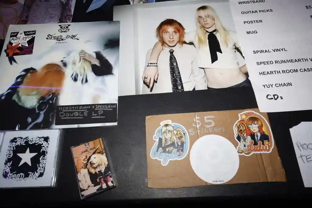 Growing up as Zoomers in St Louis, Missouri, the Prosts’ first devoured music via the YouTube algorithm on their father’s desktop computer. Angel and Lulu then developed a passion for the emo songs they’d hear in the local mall, where they shopped at Hot Topic and, in Angel’s case, sneaked a first kiss at the cinema during an “edgelord” R‑rated flick. They listened to radio rock bands The Fray and Say Anything, the latter of whom Angel denotes “twee-mo icons.”