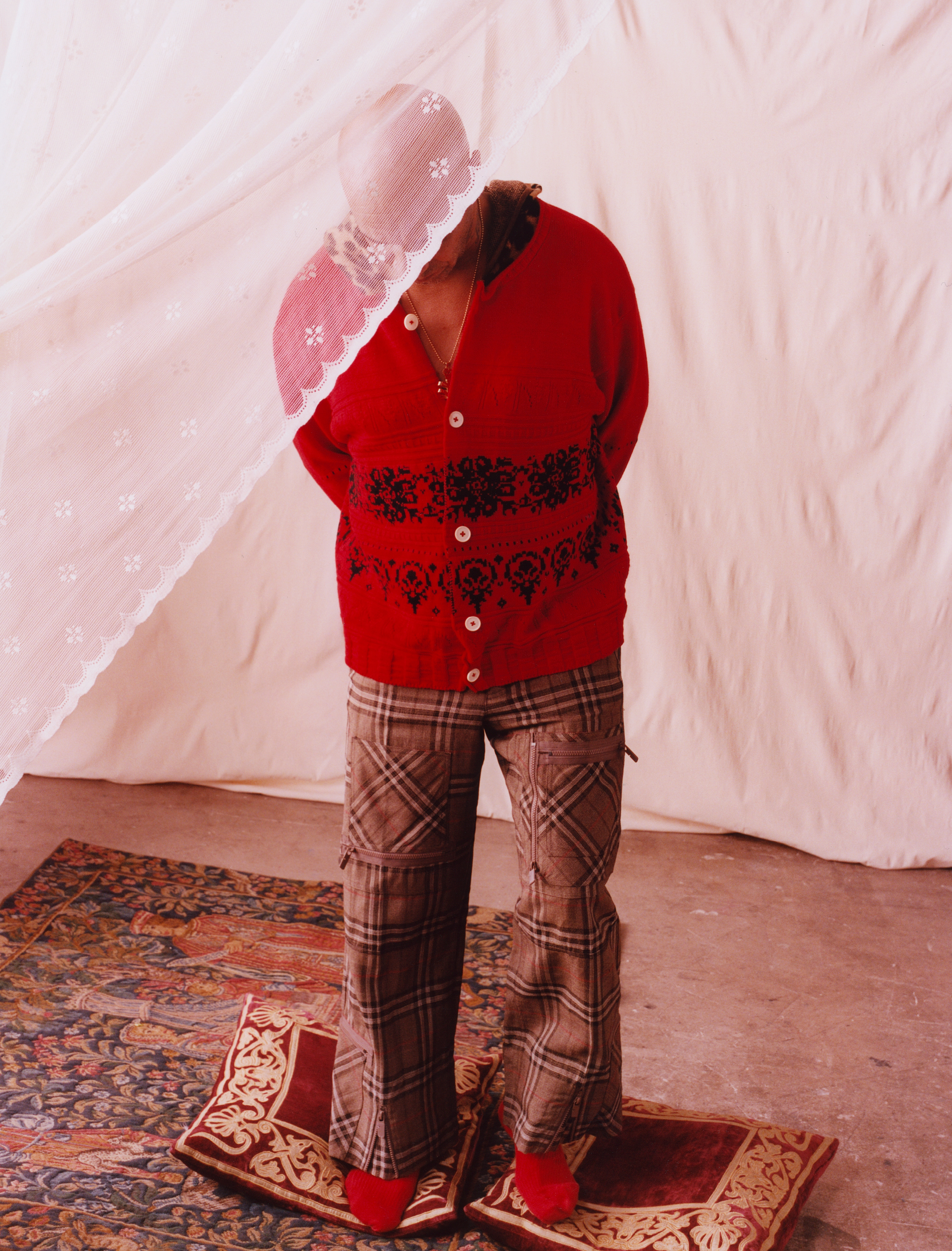 Jumper JAKE’S, trousers BURBERRY, socks stylist’s own and rings talent’s own