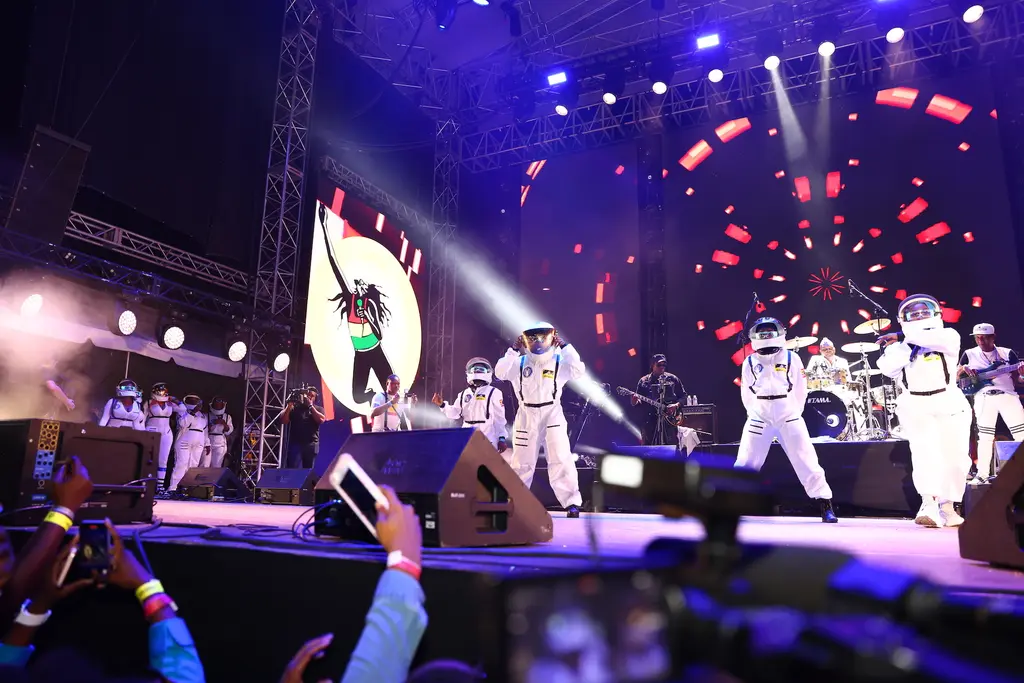 Part of the festival’s magic lies in the fact that the lineup celebrates the traditions of Jamaican music, while championing the new wave of dancehall and reggae. The main festival is split into two days – dancehall night on the Friday, reggae on the Saturday – and industry vets sit next to younger stars on the billing. On reggae night, for instance, lover’s rock legend Beres Hammond woos the crowd, just before Jamaica’s new gen reggae star Koffee takes to the stage; on dancehall night, the young Kanye and Megan Thee Stallion collaborator Shenseea whips everyone into a frenzy, getting everyone appropriately hyped for Spice to land on stage in a space suit (we’re not kidding) moments later.