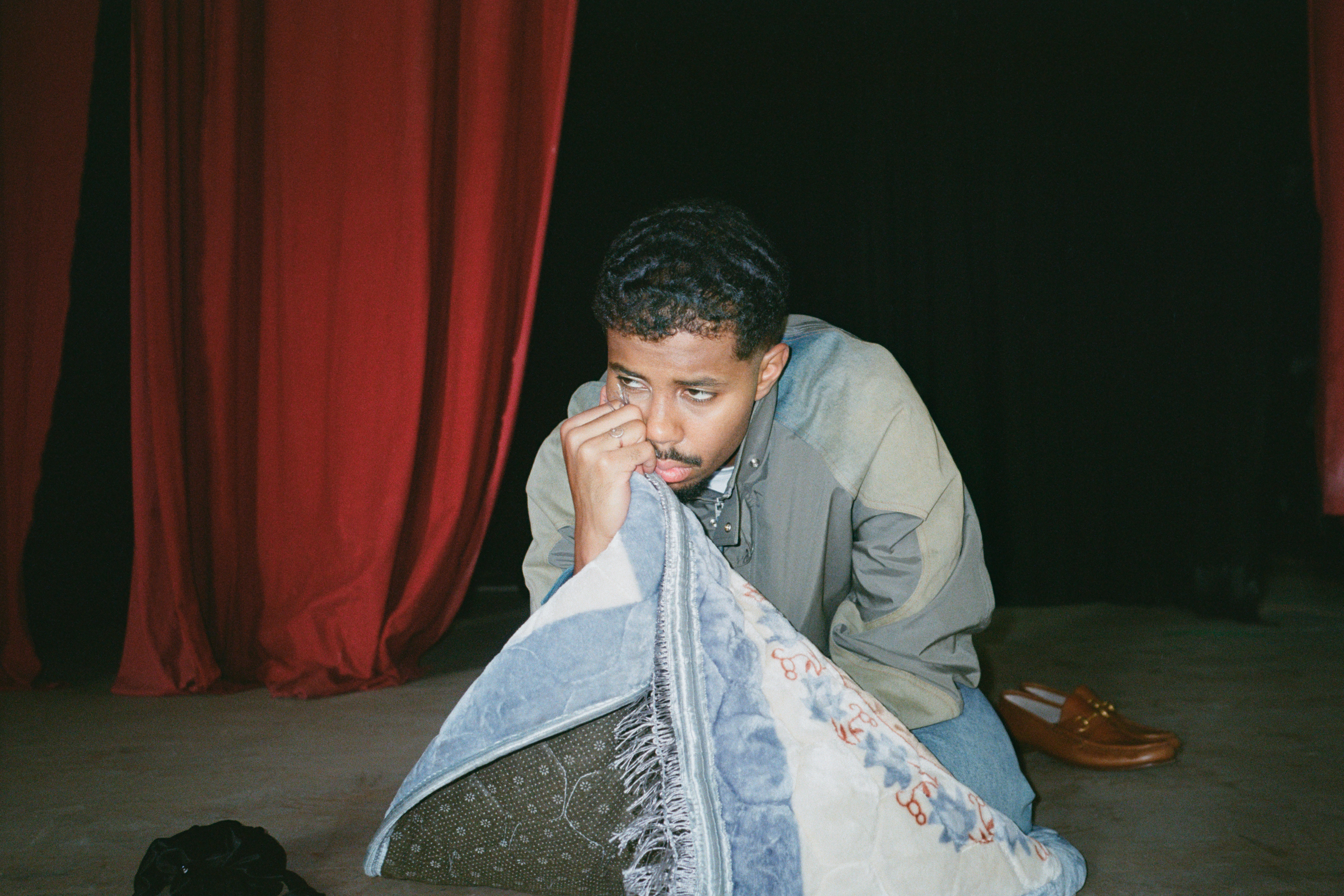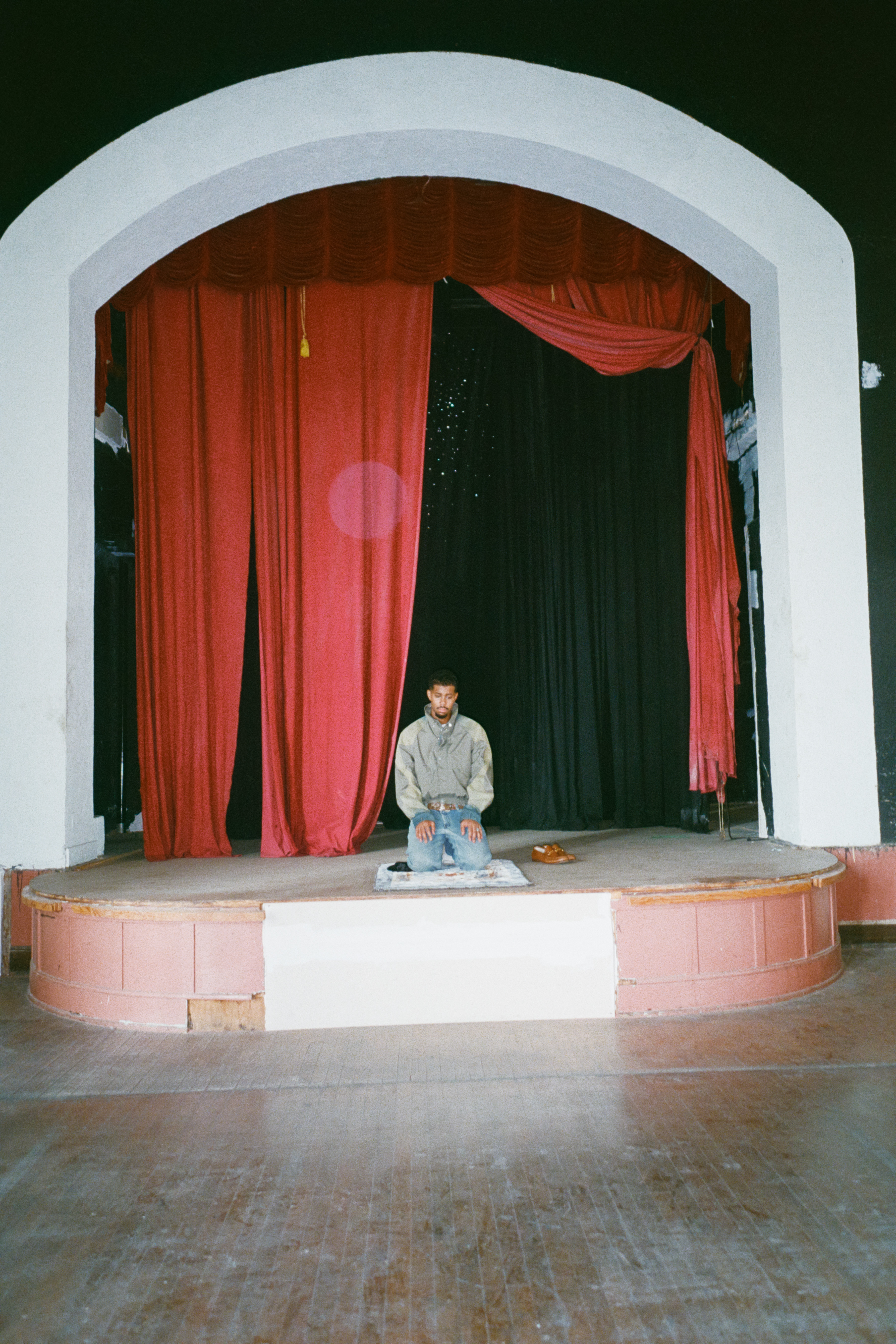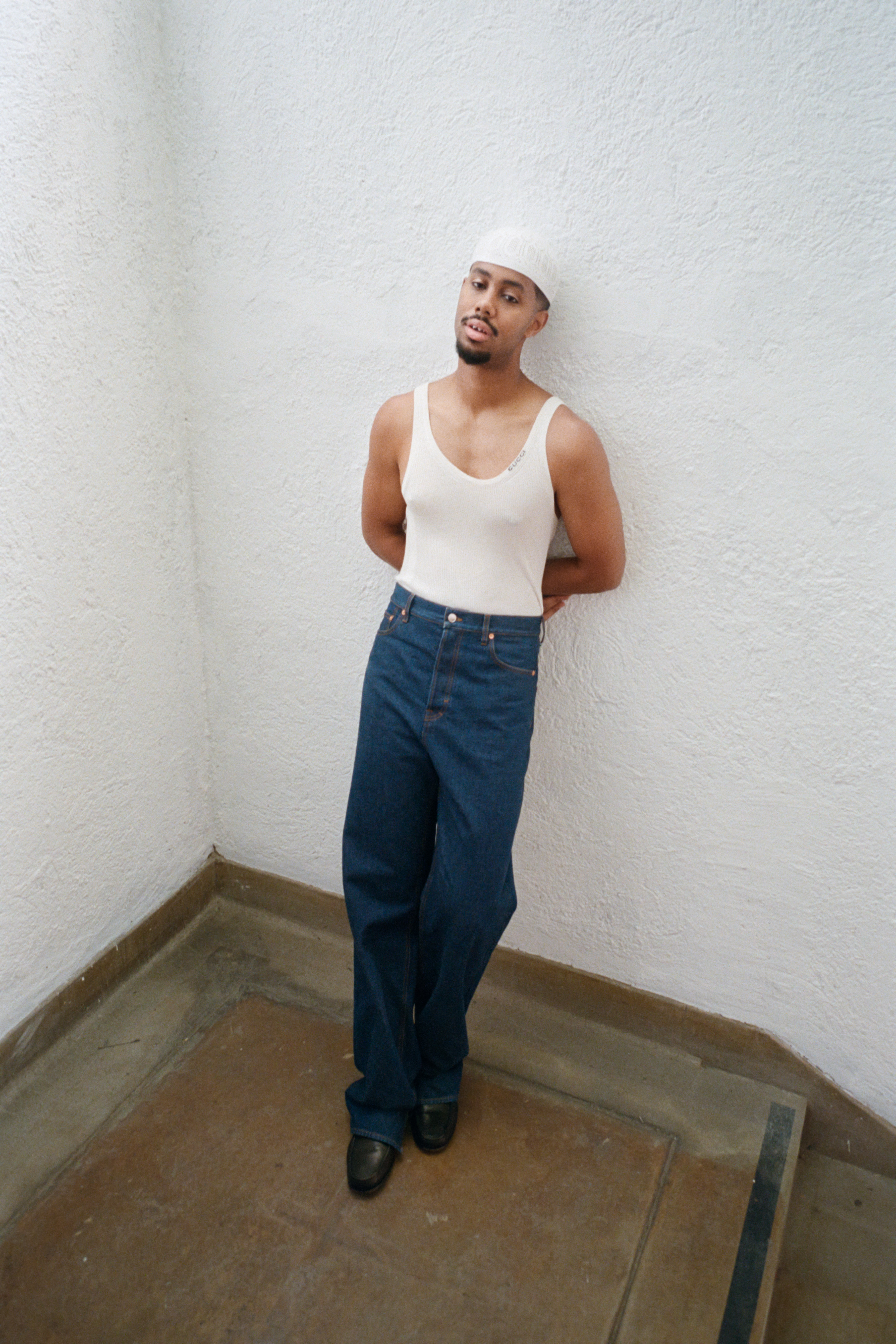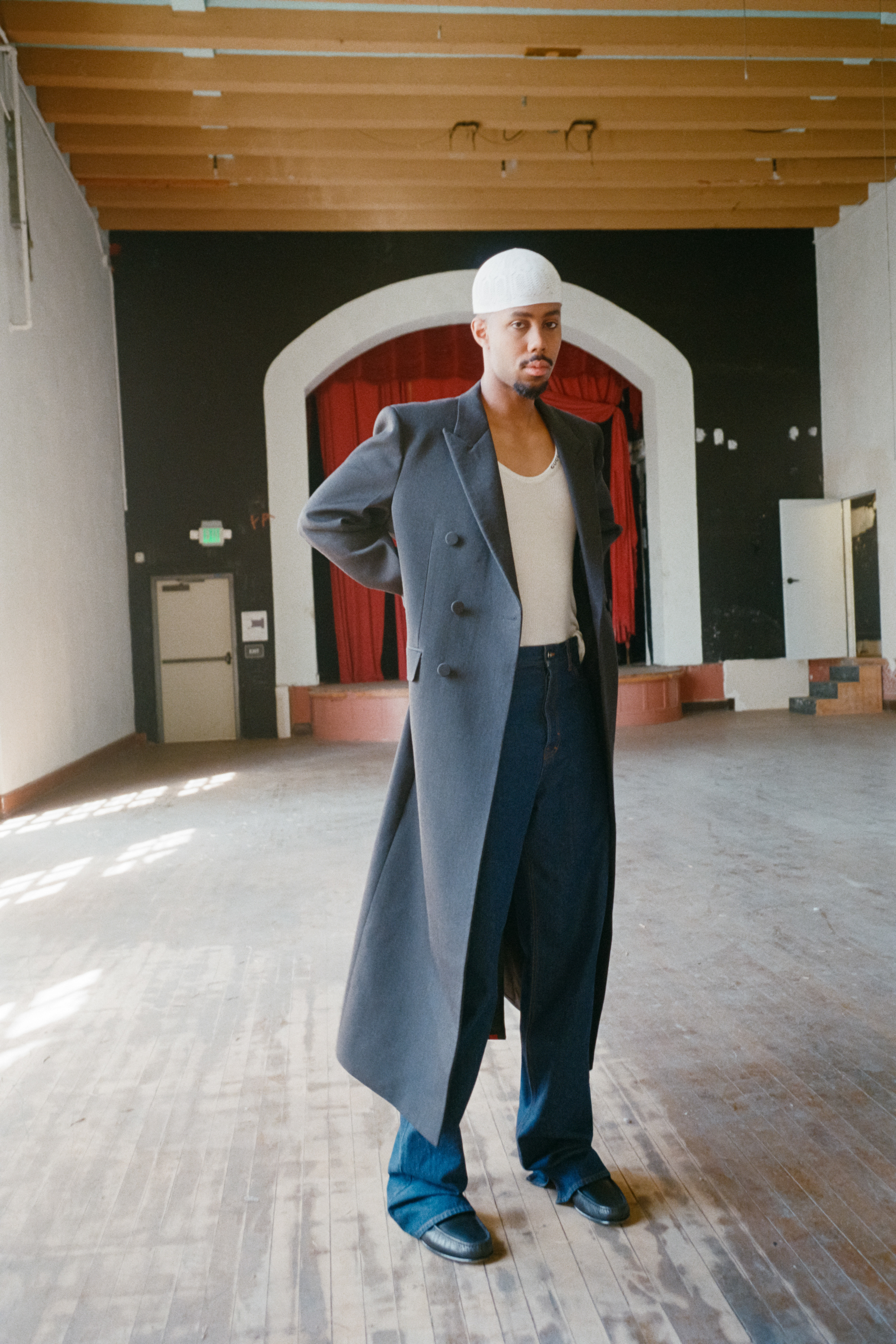 Mustafa wears jacket ACNE STUDIOS and trousers and belt archive courtesy of Varsity Los Angeles
