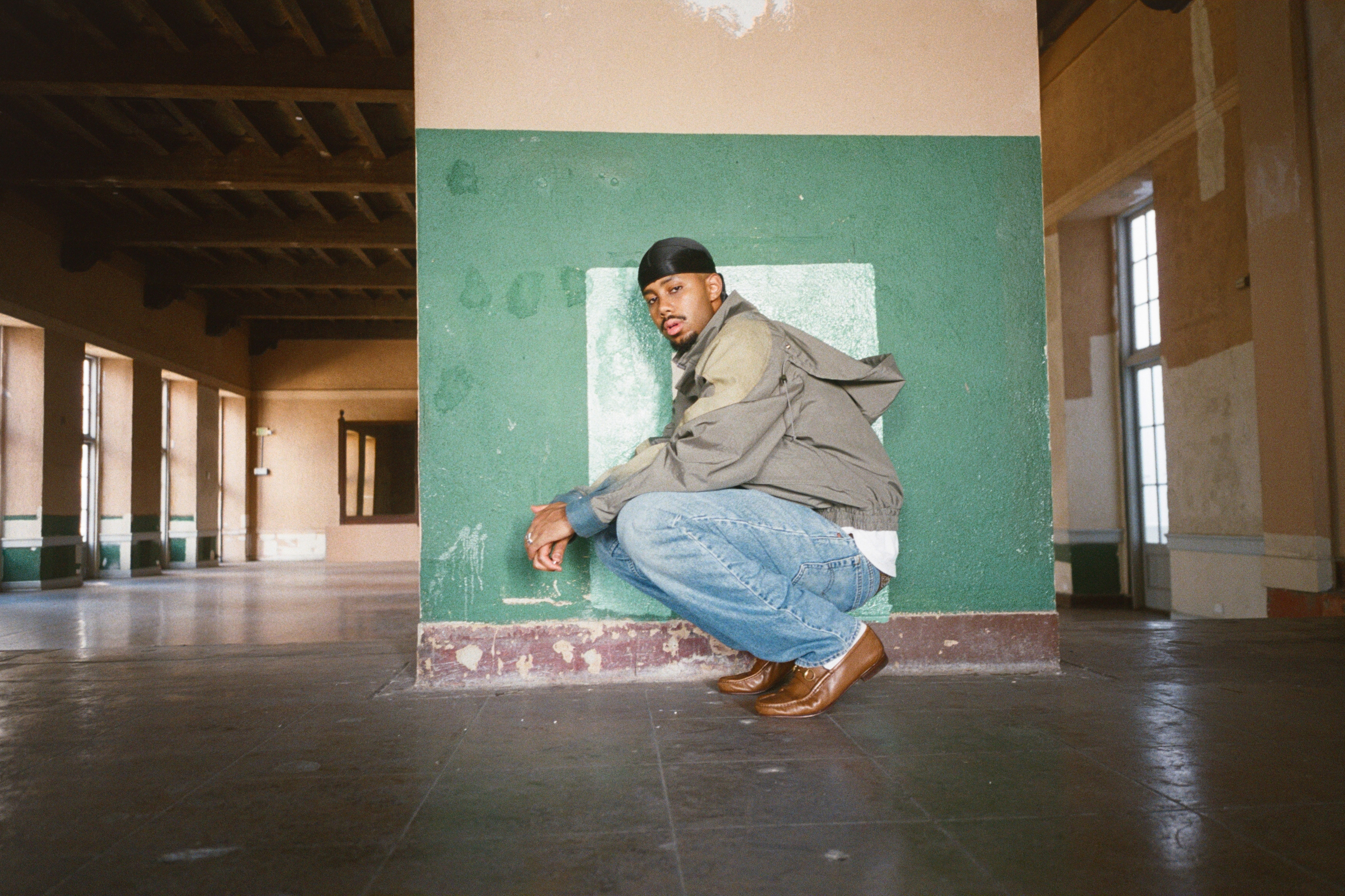 jacket ACNE STUDIOS, T‑shirt LOS ANGELES APPAREL, trousers and belt archive courtesy of Varsity Los Angeles, durag (worn throughout) talent’s own and shoes GUCCI