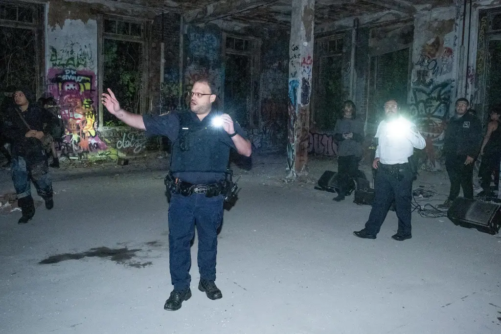 After parking, we bumble along a path until we reach a checkpoint. Two black-clad guards await us like rave valets, checking to make sure we’ve come unarmed. “This is our first rave of the night,” one of the guards says with an earnest smile. “Keep it up, you’re real,” replies a skinny, twitchy guy in a red ski mask who’d been walking alongside us. At another checkpoint, party organisers greet us; a man who looks like a Gabber Gandalf with a wizard cane urges us forward, past caution tape and derelict shipping containers. We cross a bridge, soundtracked by the relentless chitter of crickets. Finally, a derelict stone building comes into view and we hear the muffled thump of bass.