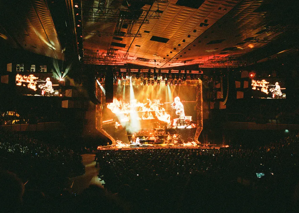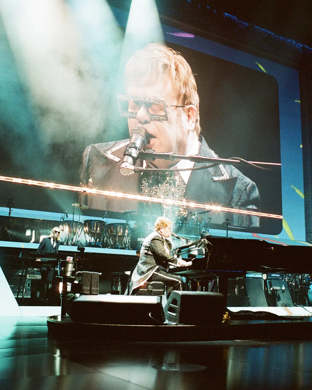 Which is why it’s funny when he sneaks on stage in such an anonymous way, the lights low enough to not quite make him out. Once the cameras do find him, as they do throughout the evening, he’s found to still be, at 72-years old, a brilliantly game performer: an opening rendition of Bennie and the Jets followed by a slam of the piano lid, a roar at the crowd and a stomp of feet like some outsized toddler dressed in Gucci. His fingers hang out of frilled sleeves like beautiful sausages wrapped in curtains, and a mere close up of them on the keys elicits a roar from the crowd like a reply of Messi at Camp Nou. Even his socks look expensive.