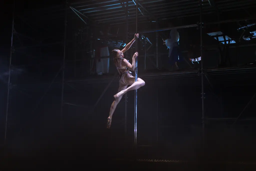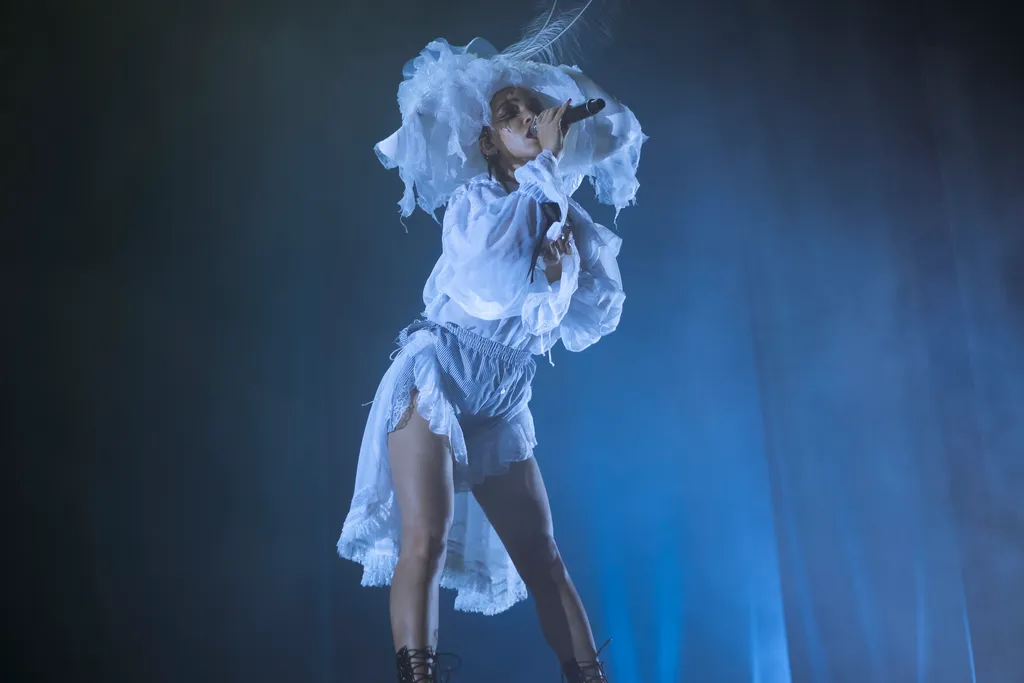 This is the first date of the consistently surprising artist’s new tour, and there’s a feeling of anticipation. Over the course of 90 minutes or so, twigs delivers a performance that could be described as operatic, evoking references like Egyptian opera Aida and kabuki theatre (complete with a sword dance) with an avant-garde twist. At one point, the long curtains, on which blue skies with thick white clouds are projected, fall to reveal the skeleton of her backdrop: a scaffolding, illuminated by LED strobes, that holds four dancers as well as twigs’ three piece band, which includes accomplished cellist Lucinda Chua.