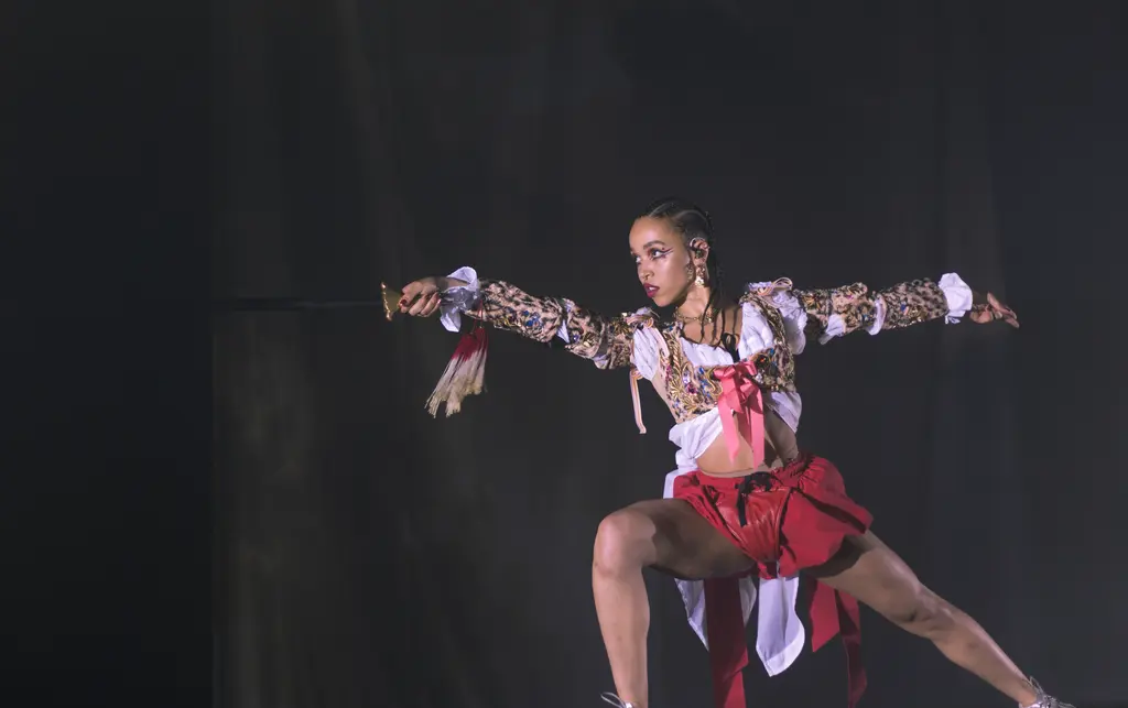 FKA twigs is standing in front of the red velvet curtains of the Los Angeles Palace Theater dressed in a black and white jester outfit by designer Ed Marler, impossibly cool sunglasses, with hair pulled back in cornrows. She’s captivating the audience with the rhythmic clack of her feet on the wooden stage.