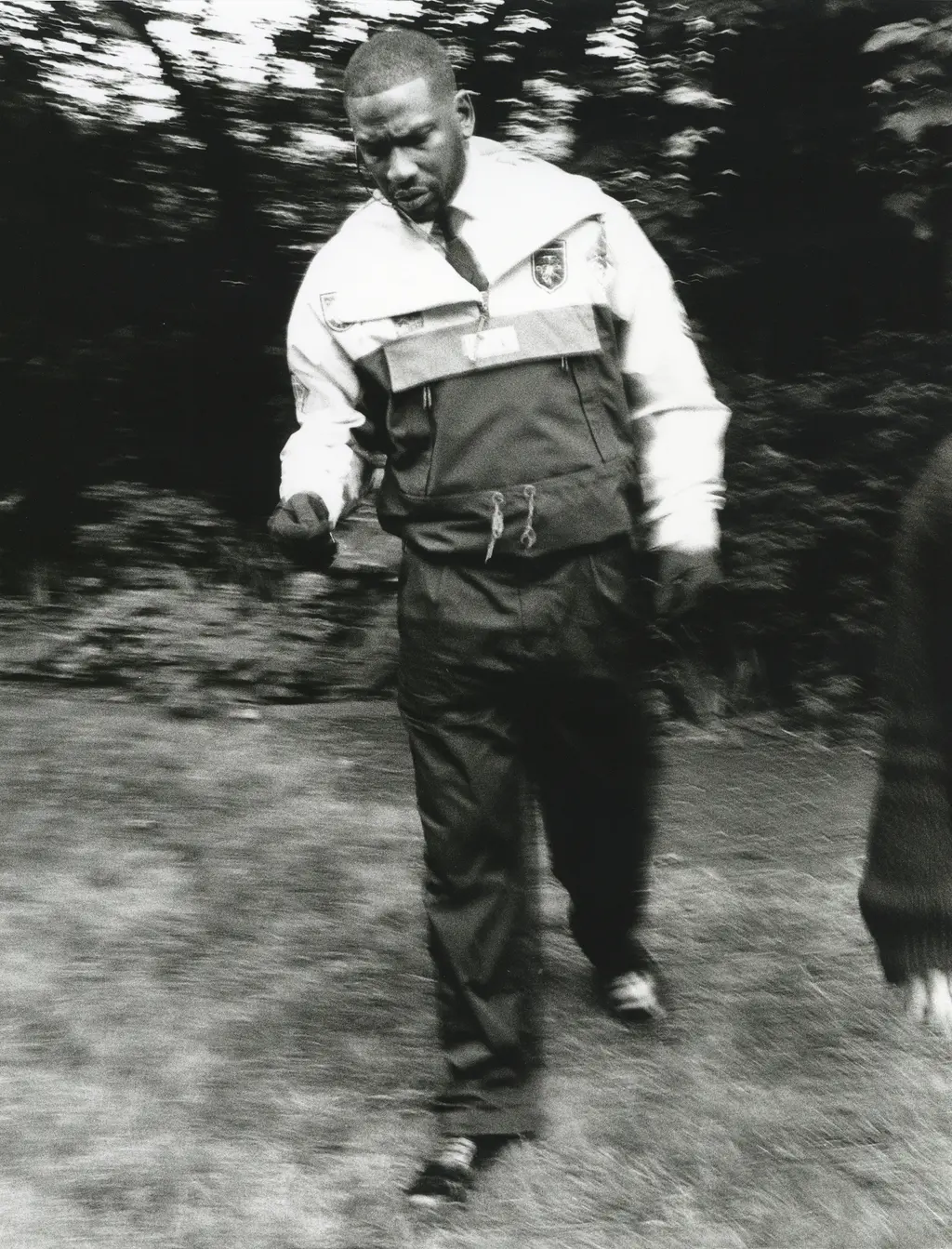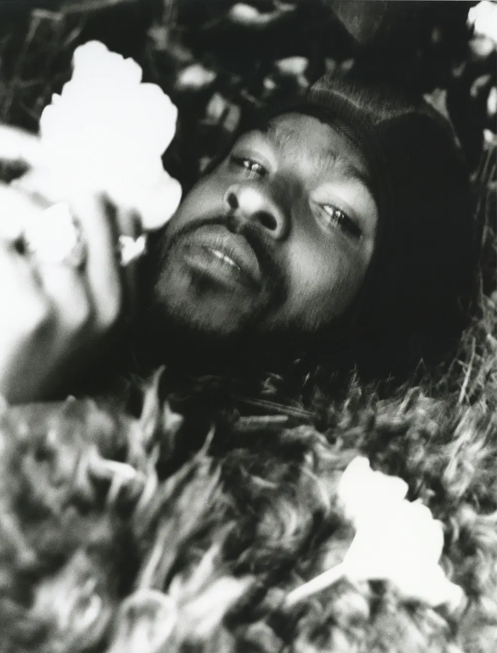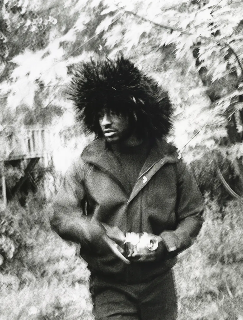 Now, at THE FACE’s photoshoot, taking place on a pleasant spring afternoon in Northwest London, he’s getting in the mood for his inaugural Big Smoke Festival – which runs at Crystal Palace Park on 6th July and features cutting-edge acts such as Nigerian genre-blender Odumodublvck and amapiano queen Uncle Waffles – by impersonating security guards and sniffing a white hibiscus while sprawled out on the grass at the location.