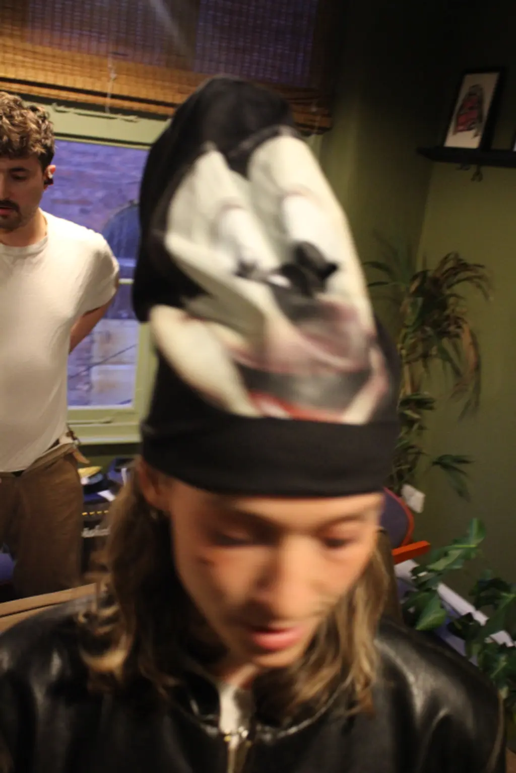 The 28-year-old – who forms the songwriting partnership at the core of the band, alongside her schoolmate and best friend Louis O’Bryen – is perched on a piano in Sorry’s cramped North London writing room. She’s wrapped up in sweats and a puffer jacket, chaining cigarettes as she recalls the “orchestra thing” where she actually met Curtis. She and her friend “ended up going backstage and he was there and we had pints with him.